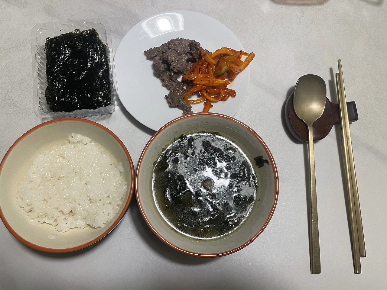 몇 번의 수업에 불과한데도 그의 손놀림에 거침이 없습니다. 소금으로 도라지를 씻어내고, 오이 씨를 발라내 절이는 모습이 제법 능숙합니다. 미역과 고기를 볶아 국물을 내는 사이, 절여진 도라지를 손으로 바락바락 무쳐내는 뒷모습에서 진심이 뚝뚝 묻어납니다. 양념 고기를 정성껏 치대어 팬에 굽는 소리가 집안을 맛깔나게 채운 지 한 시간, 드디어 기적 같은 생일상이 준비되었습니다.
