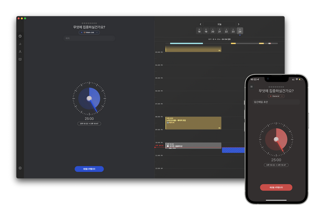 뽀모도로 타이머는 언제 어떠한 상황에서도 바로 업무에 집중할 수 있도록 도와줍니다. 타이머를 켜는 그 순간 마치 파블로프의 개처럼 긴장되는 초시계 소리와 함께 업무에 빠져드는 것이죠. 덕분에 나도 모르게 일을 미루는 습관들을 막아주는데 큰 도움이 되죠. Session 은 다양한 뽀모도로 앱 중에서도 제가 제일 좋아하는 뽀모도로 앱 입니다. 이유는 디자인이 예쁘고, Mac 과 iPhone 이 동기화 되며, 캘린더를 불러오기에 혹시나 집중하는 시간 때문에 일정을 놓치는 일이 없도록 도와줍니다. 깔끔하고 편리한 기능 모두 만족스러운 뽀모도로 타이머 입니다.