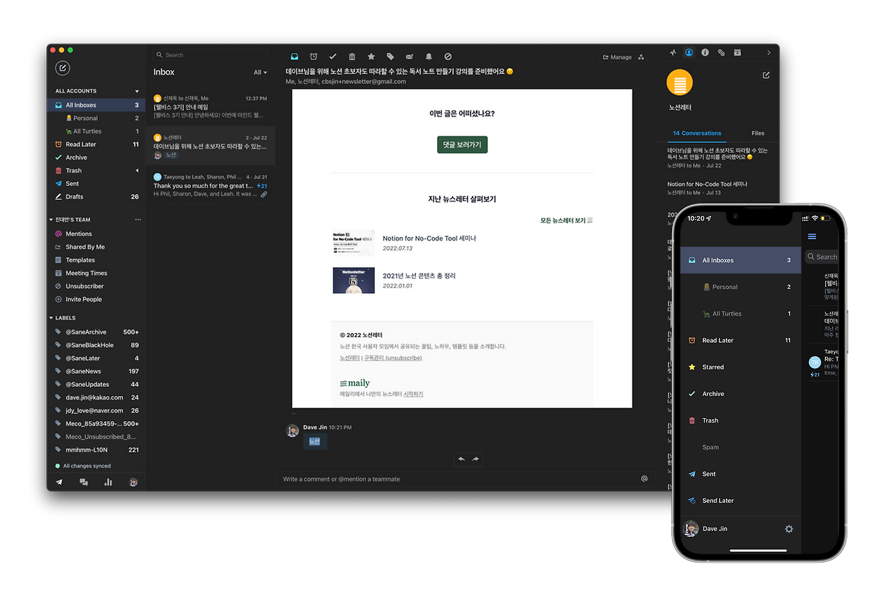 Polymail은 다른 이메일 클라이언트와는 다른 몇 가지 강력한 기능들이 있습니다. 상대방이 이메일을 읽었는지 여부를 확인할 수 있고, 이메일에 나만의 메모나 댓글을 남길 수 있으며, 특정 이메일 쓰레드의 링크를 생성하여 외부와 공유할 수도 있죠. 물론 그밖에도 자동 스팸 필터 및 구독해지 기능, 회신이 없는 이메일에 대한 리마인더 기능 등 정말 알찬 기능들이 많아 비싼 구독료에도 꾸준히 사용하고 있습니다.