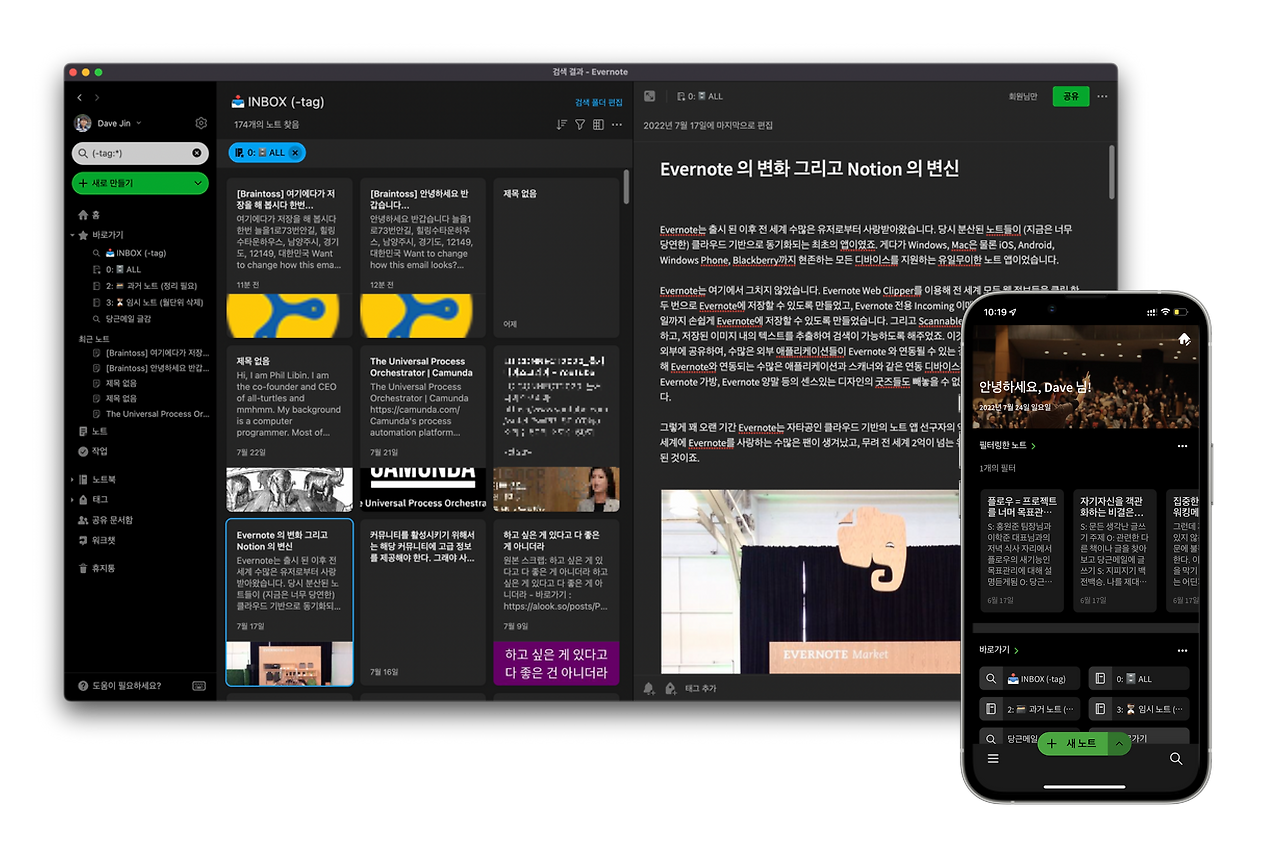 Notion의 가장 큰 장점이 ‘정리’라면 Evernote의 가장 큰 장점은 ‘검색’입니다. 세상의 모든 정보들을 쉽게 저장해두고 나중을 위해 찾아보는 용도로 Evernote를 사용하고 있습니다. 예를들어 공과금 영수증, 세금 영수증, 임대차계약서, 가족관계증명서 등과 같은 수많은 서류들은 그냥 스캔을 해서 저장만 해두어도 언제든지 검색을 통해 손쉽게 정보를 찾아볼 수 있죠.