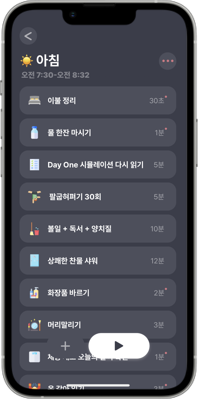 루티너리는 힘든 아침을 깨워주는 강력한 장치 입니다. 아침에 멍때리며 시간을 보내기 쉽상인데요. 조금만 정신차리고 루티너리만 켜면 어느새 출근 준비가 끝난 자신을 발견하게 됩니다. 특히나 아침마다 꼭 챙겨야할 것들을 잊어버리는 경우가 있는데 (몸무게 재기, 에어팟 챙기기 등) 루티너리 안에 챙길것들을 꼼꼼히 스텝으로 넣어두면 정신없는 아침이 여유있는 아침으로 바뀌게 됩니다.