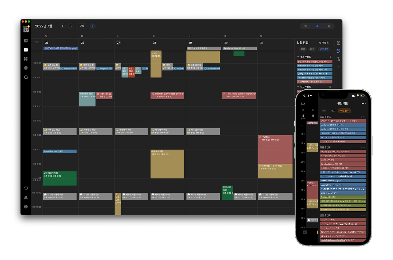 저는 할일관리 도구로 TickTick 을 사용하고 있습니다. TickTick 을 사용하는데에는 여러 이유가 있지만 무엇보다도 일정을 캘린더 위에 손쉽게 배치할 수 있기 때문입니다. 정말 많은 할일관리 앱들이 있지만 안타깝게도 캘린더를 품고 있는 할일관리 앱은 거의 없습니다. 아! 한가지 Google Task 가 캘린더와의 궁합이 좋습니다. 다만 클라이언트 앱을 선호하는 저에겐 TickTick 이 유일한 대안입니다.