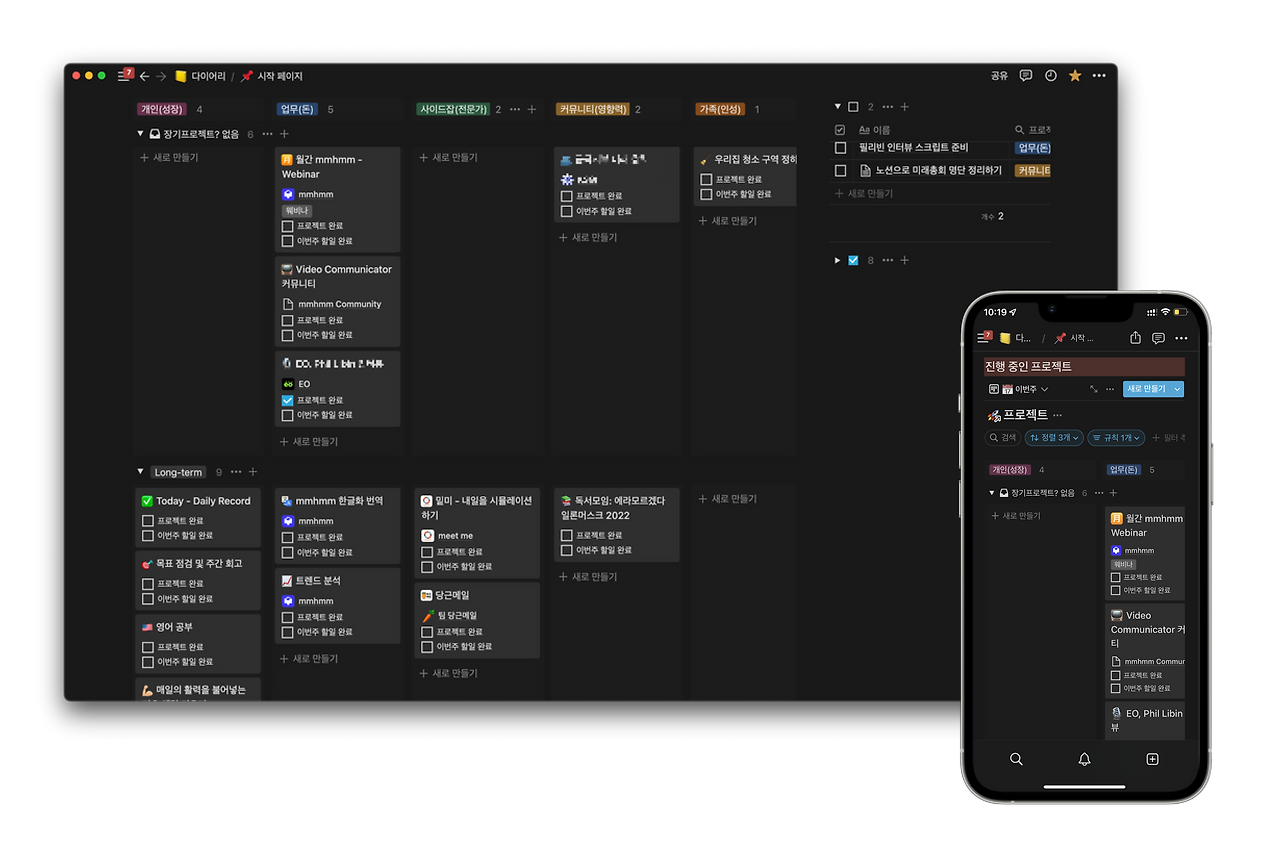 Notion 과 Evernote 에 대해서는 지난 당근메일에서도 언급했지만 둘다 저에게 없어서는 안되는 필수앱입니다. 특히나 Notion에는 저의 개인 및 회사의 프로젝트를 모두 담아 관리하고 있기 때문에 하루에도 수십번씩 접근하는 도구입니다. 프로젝트 관리 도구로 Notion 을 사용하는 이유는 아무래도 내가 원하는 환경을 내 마음대로 만들 수 있기 때문입니다. 그리고 만들어놓은 환경은 때에 따라 변형이 필요할 때가 있는데요. Notion의 자유도는 원할때 손쉽게 시스템을 스스로 변경할 수 있어 매우 편리합니다. 덕분에 Notion은 저에게 완전히 최적화된 개인화 다이어리가 되었습니다.