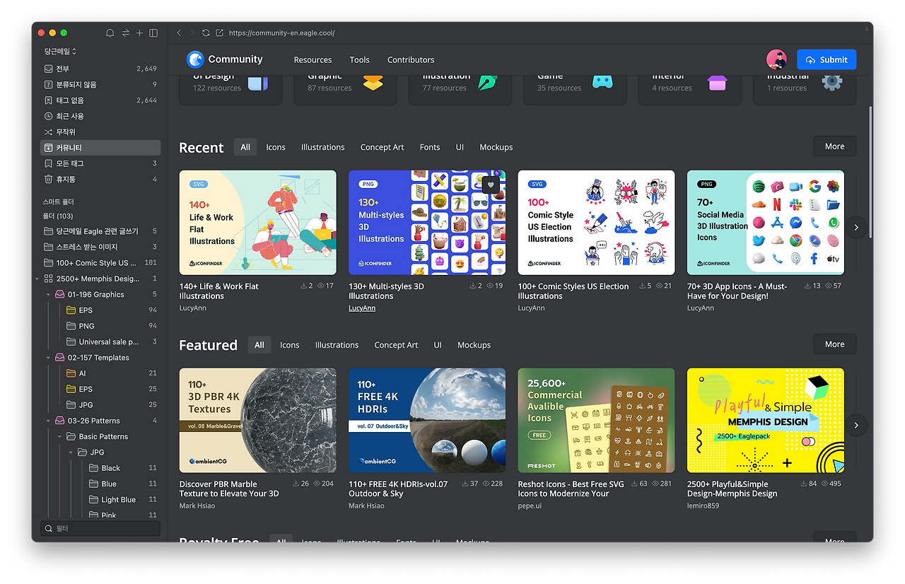 Eagle은 자체 커뮤니티도 가지고 있는데요. 이곳 커뮤니티에서 다른 사람이 공유한 다양한 파일 또는 이모티콘을 손쉽게 가져올 수 있습니다. 또한 자신의 Eagle은 폴더 전체를 Eaglepack 으로 추출하여 다시 커뮤니티에 공유하는 것도 가능합니다.
