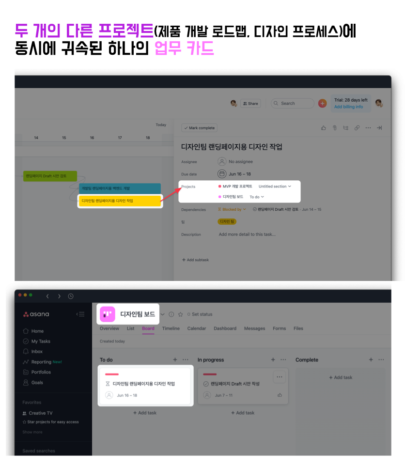 Asana는 하나의 업무를 멀티 프로젝트에 귀속시킴으로써 이 문제를 해결하였습니다. 예를들어, A라는 큰 규모의 프로젝트에 필요한 프로젝트 보드를 Asana에 만들고, 타임라인 형태의 보기모드로 표시합니다. 그 안에 생성되는 업무 카드들은 각 팀별 프로젝트 보드에 동시에 귀속시킬 수 있는데, 이를 통해 A프로젝트 보드가 아닌 팀별 프로젝트 보드에서 그들의 업무 프로세스에 맞게 일을 진척시킬 수 있습니다. 이젠 A프로젝트 보드를 통해 전체 진행사항을 확인하고, 각 팀은 팀 프로젝트 보드를 통해 팀의 방식에 맞도록 업무를 관리합니다. 즉, 여러 팀이 함께 일을한다고 해서 기존의 팀별 프로세스를 포기하지 않아도 되는 것이죠. (하단 이미지 참고)