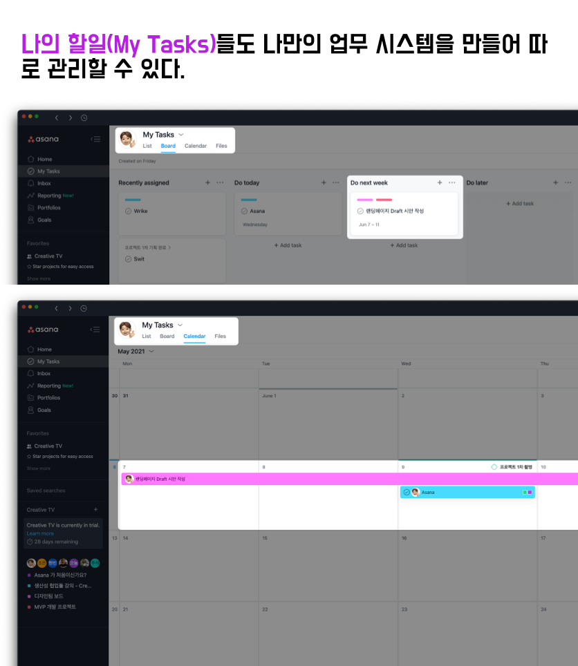 또한, My Tasks 탭을 통해 나에게 지정된 업무들만 따로 관리도 가능합니다. 이곳에서는 자신의 취향에 맞도록 나만의 시스템을 만들 수 있습니다. 이젠 큰 그림을 보기 위해서는 전체 A프로젝트 보드를 확인하고, 팀별 진척도를 확인하기 위해서는 팀 프로젝트 보드를 확인하고, 나의 업무에 집중하기 위해서는 My Tasks 보드를 확인하면 됩니다. 이는 하나의 업무 카드를 다양한 관점에서 보고 관리할 수 있도록 도와줍니다.