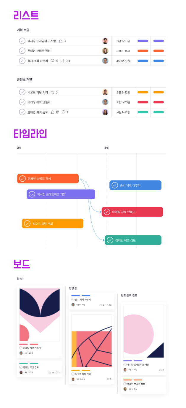 앞서 설명한 것 처럼 Asana는 너무 많은 업무로 압도되어 제대로 일을 처리하지 못했던 과거의 경험을 바탕으로, 보다 업무에 집중 할 수 있는 협업 툴 환경을 만들기 위해 노력했습니다. 디자인 역시 최대한 심플하게 유지하고 있으며 리스트, 타임라인, 보드라는 핵심 세가지 형태의 화면을 제공합니다.