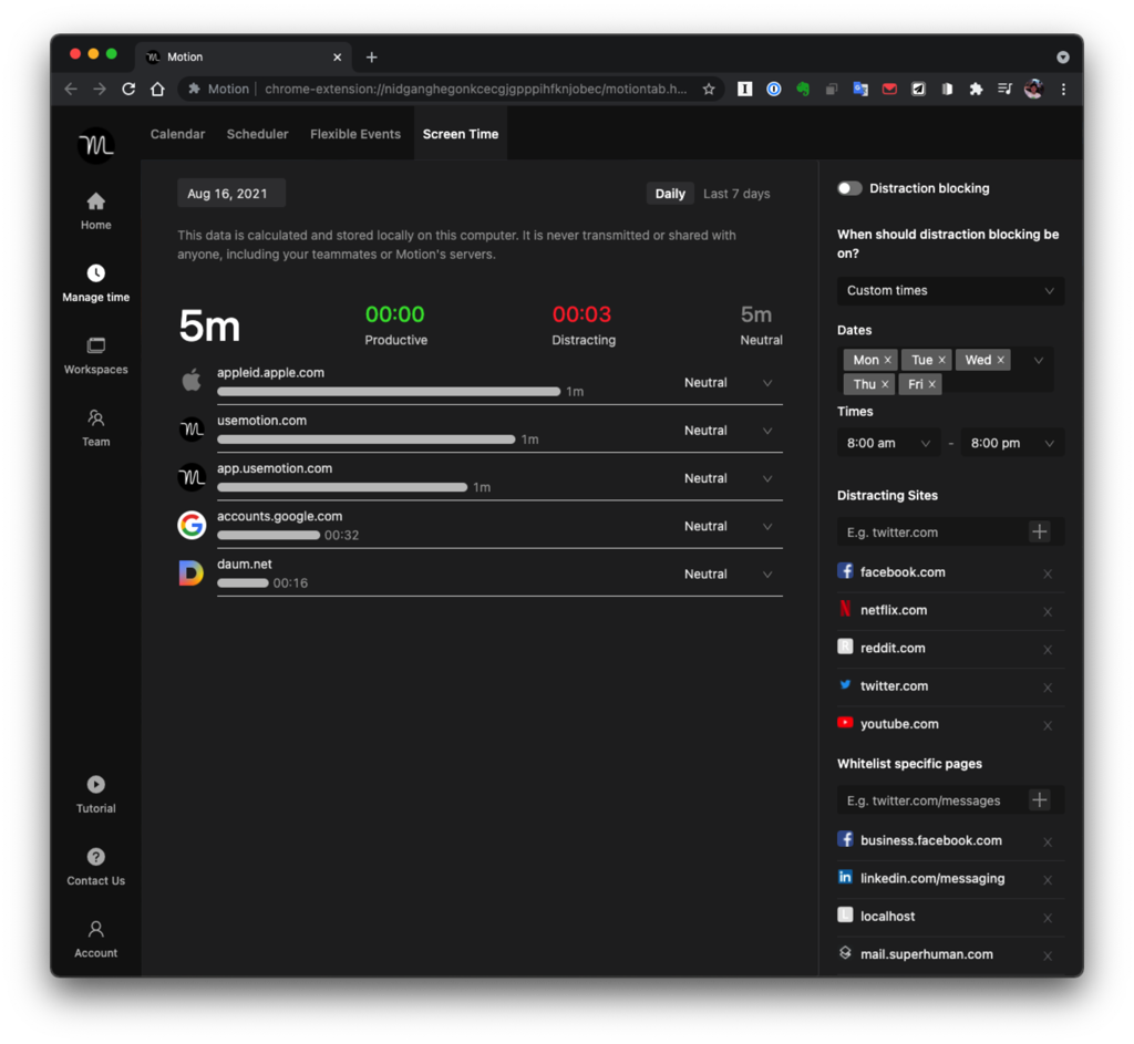 Motion 은 세상에서 가장 빠른 캘린더라는 모토로 탄생했습니다. Chrome 확장프로그램으로 지원되고 있어, 크롬 사용자라면 OS에 상관없이 어디서든 사용이 가능합니다. 이메일, 할일 관리 등 대부분의 서비스가 웹기반이기에 언제든 브라우저에서 캘린더를 확인하거나, 온라인 미팅에 참여하거나, 스케쥴 링크를 손쉽게 전달할 수 있습니다.