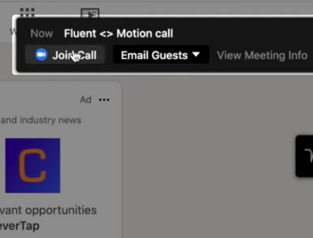 또한, 온라인 미팅 일정이 다가오면 자동으로 원클릭 Join Call 버튼이 브라우저에 나타납니다. 일을 하다가 막상 온라인 미팅 일정이 되면 온라인 미팅 링크를 찾느라 여기저기 해매는 경우가 많은데, Motion 은 알아서 클릭버튼을 제공하기에 그냥 클릭만 하면 끝납니다.