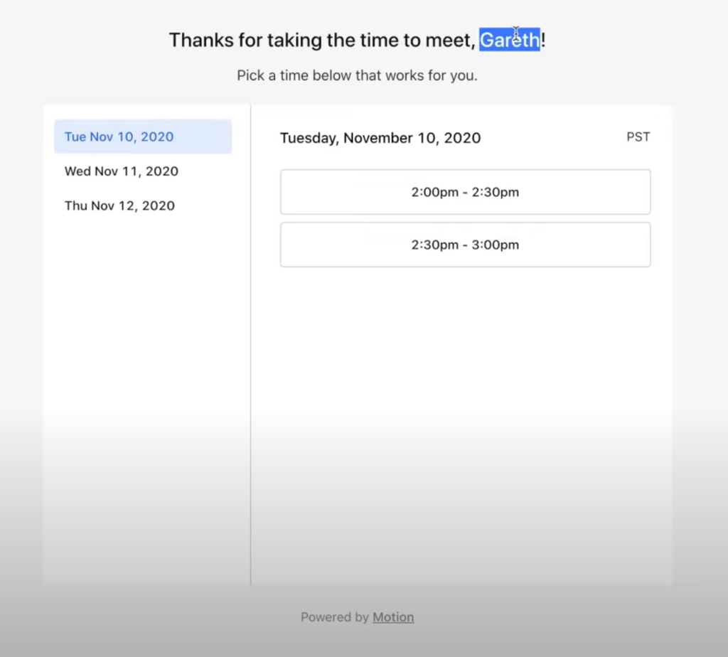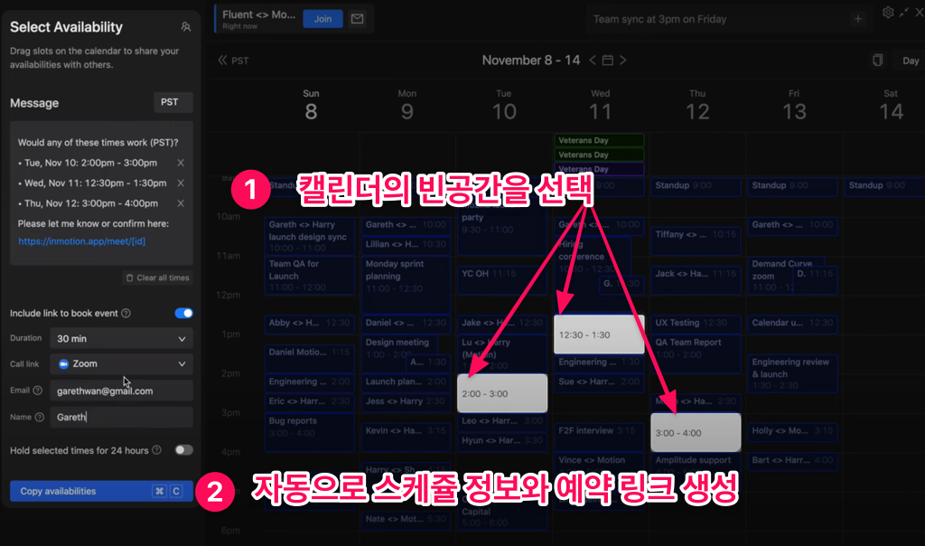두번째는 바로 미팅 스케쥴러 기능입니다. 이메일을 작성하거나, 친구와의 채팅 메시지를 주고받는 중 갑작스럽게 미팅 일정을 잡아야 할 때 한번에 끝나는 경우가 좀처럼 없습니다. 이를 위해 Calendly 또는 YouCanBook.me 와 같은 서비스들을 사용하는데요. Motion 은 이러한 서비스를 따로 사용할 필요 없이 자체적으로 스케쥴 선택 링크를 만들 수 있습니다.