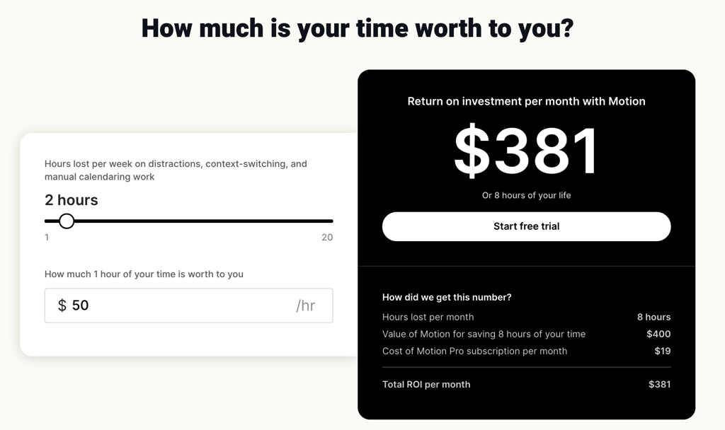 다만, 가격적으로는 다소 비싸게 느껴지는데요. 매달 19USD (한화 약 2만 3천원) 의 금액으로 사용하실 수 있습니다. 그들의 가격페이지는 이를 의식이라도 한듯 내가 더 집중하고 가치있는데 시간을 보낼 수 있다면 그 가치는 더 클 것이라는 비교 계산기를 보여줍니다. 또한, 한글도 아직 지원되지 않는다는 점도 다소 아쉽습니다.