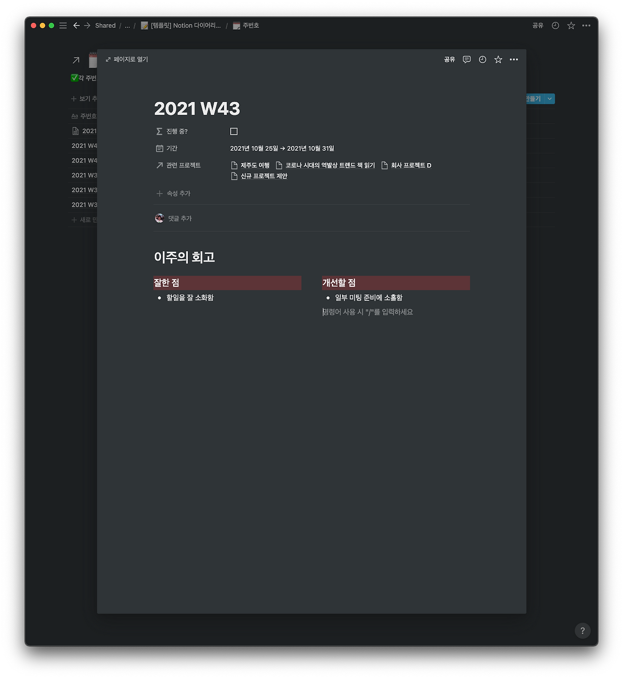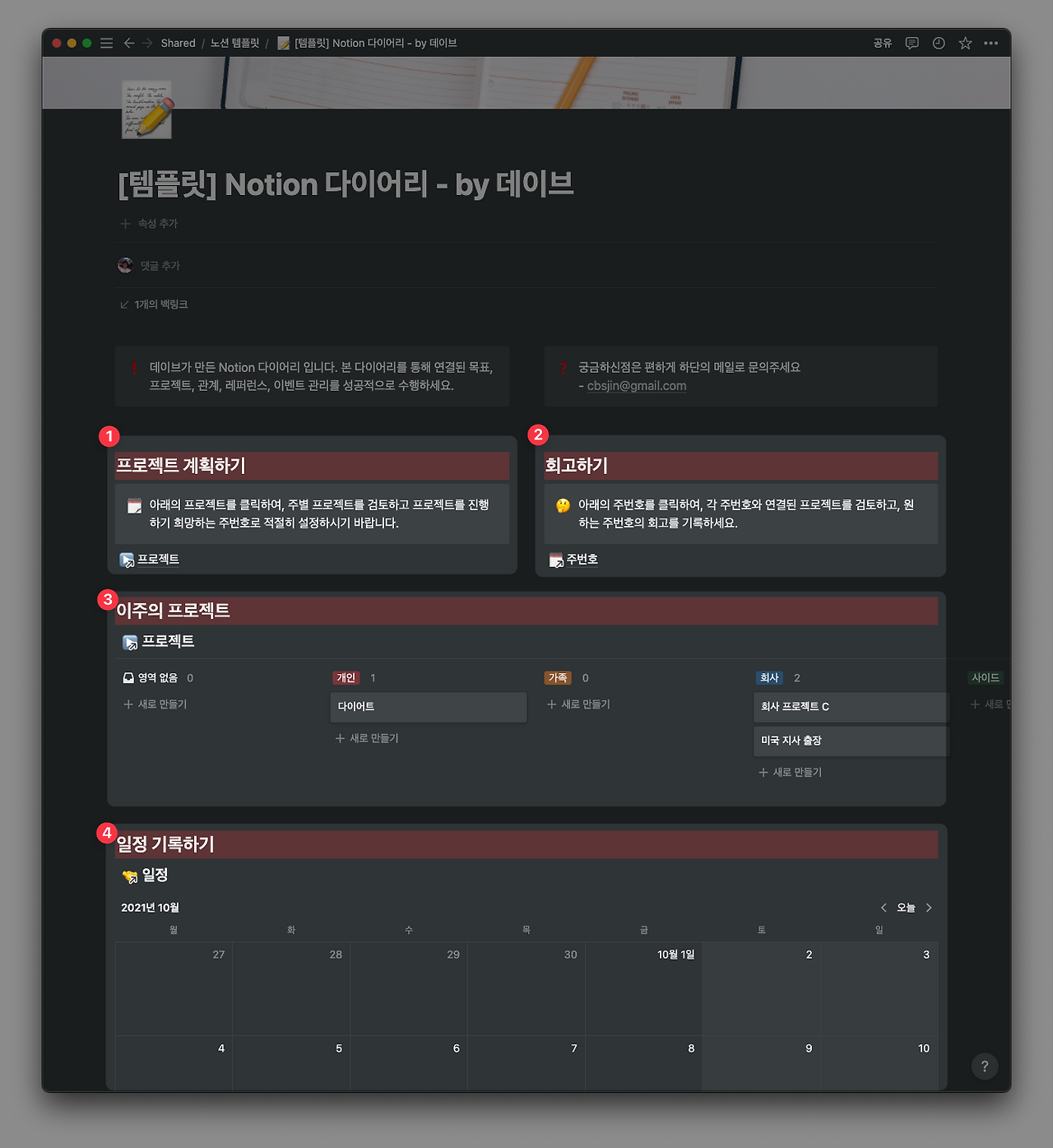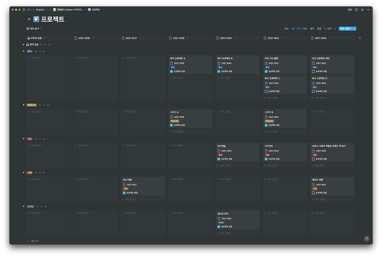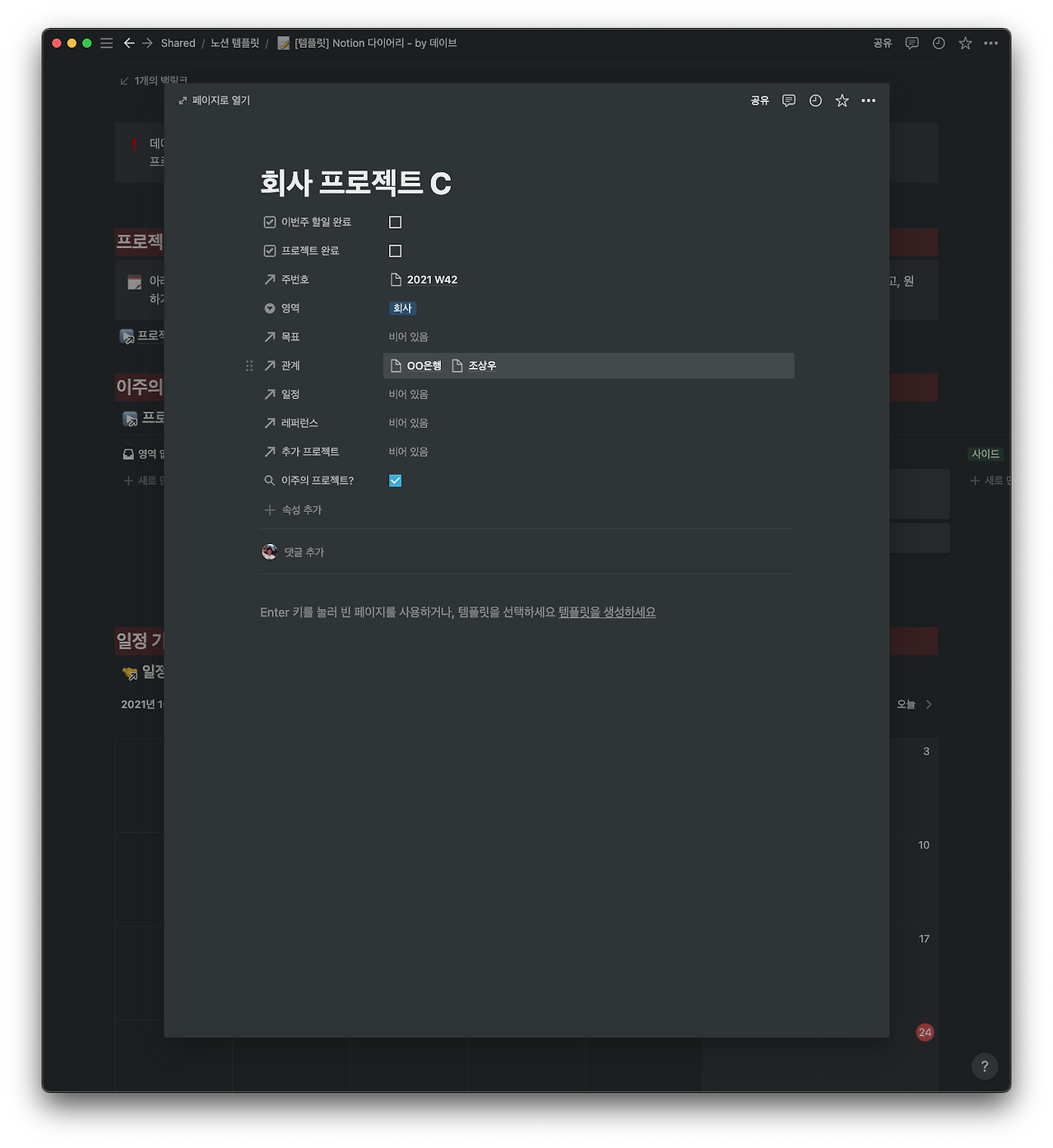 이주의 프로젝트 섹션에는 이번 주에 진행하기로 한 프로젝트들이 개인, 가족, 회사, 사이드잡, 커뮤니티 항목으로 구분되어 자동으로 표시됩니다. 해당 카테고리가 본인에게 맞지 않는다면 본인에게 맞는 카테고리로 변경해서 사용하시면 됩니다. 각각의 프로젝트 데이터베이스 본문에는 프로젝트와 관련한 다양한 정보들을 담을 수 있으며, 추가로 [목표], [관계], [일정], [레퍼런스] 및 [추가 프로젝트] 속성에서 관련 데이터베이스로 연결할 수 있습니다.