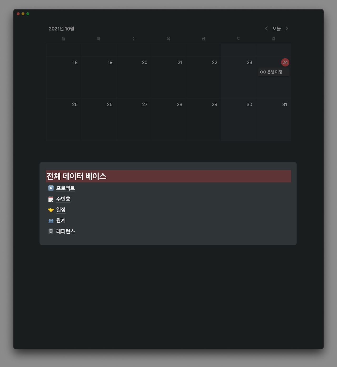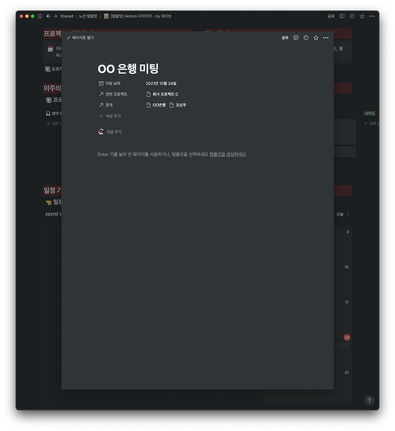 마지막으로 [일정 기록하기] 섹션을 알아보도록 하겠습니다. 일정 기록하기 섹션은 기록하고 싶은 주요 일정들을 캘린더 위에서 바로 기록하실 수 있습니다. 일반적으로 미팅회의록 등에 활용할 수 있습니다. 역시 각각의 일정과 관련된 [프로젝트]와 [관계] 속성 내에 관련 데이터베이스를 추가하여 사람/회사 또는 관련 프로젝트 데이터베이스를 손쉽게 연결 할 수 있습니다.