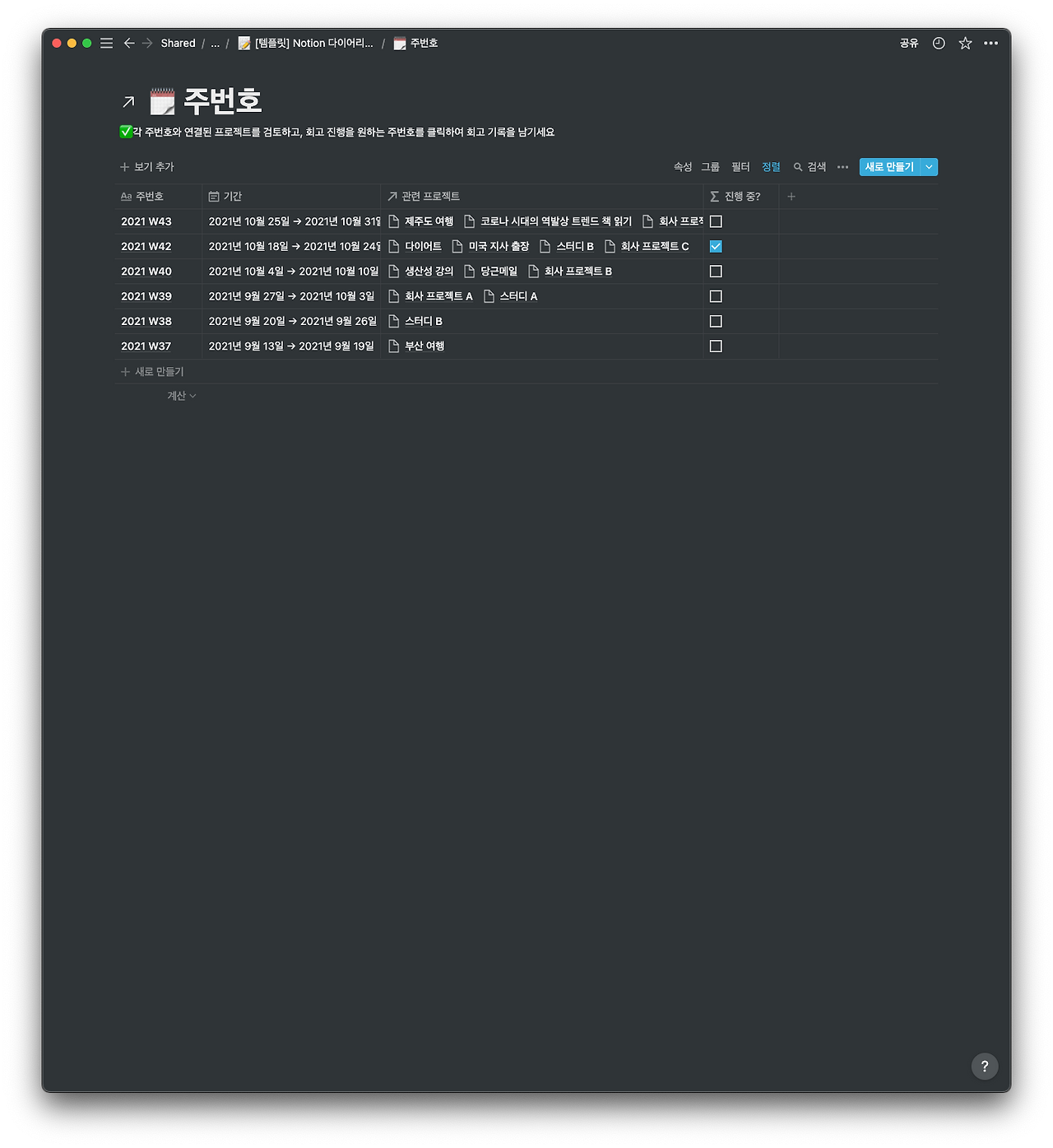 2번째 섹션인 회고하기 하단에는 [주 번호] 페이지 바로 가기가 있습니다. 해당 페이지로 이동하면 아래와 같은 표가 나타납니다. 미래의 주 번호를 추가하고 싶다면 [새로 만들기] 버튼을 통해 새 데이터베이스를 만들고 [2021 W45]와 같은 형식의 주 번호 타이틀과 주번 호의 기간 속성도 직접 입력해주셔야 합니다. 다소 번거로운 작업일 수 있지만 일주일에 한 번 회고 작업을 진행할 때 수행해주시면 좋습니다. 이번 주의 주 번호를 확인하고 싶으시다면 이곳 링크에서 빠르게 확인하실 수 있습니다.
