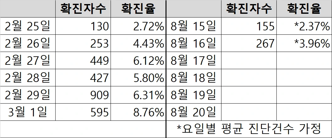 최근에는 검사 건 수를 공개하지 않아 확진율을 알 수는 없지만 평소 주말에 7천 건 정도의 검사건수를 가정한다면 약 4% 정도 확진율이 예상됩니다.