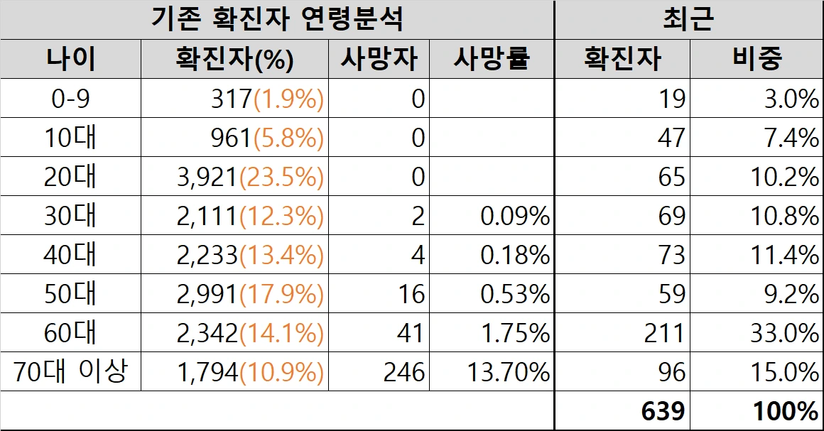 (60대 이상 확진자 비중 높음)