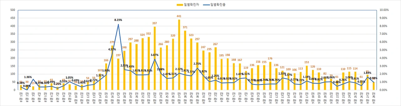- 진단건수 5,077건(-725건), 확진율 0.98%(-0.66% P)