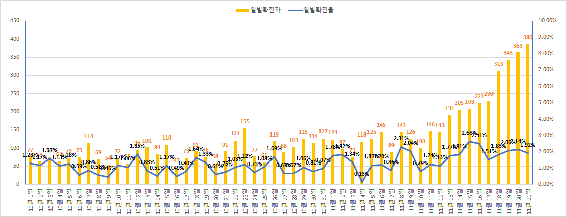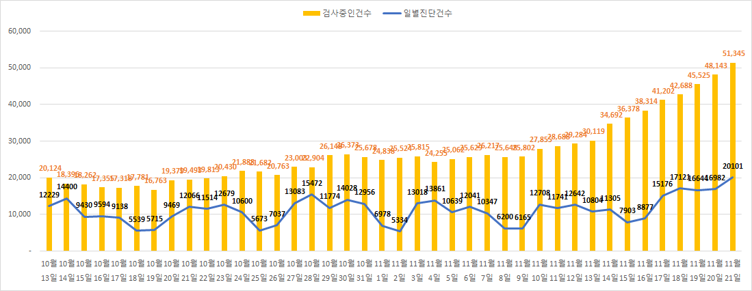 오늘 지역감염 361명으로 전일대비 41명 증가하였습니다. 진단건수가 2만 건을 넘었으나 진단 대기 건수도 5만 건을 넘어 검체 수집 후 확진 기간이 점점 증가하고 있습니다. 당분간 확산세가 지속될 것으로 보입니다.