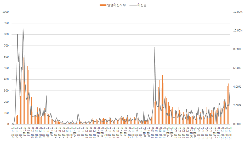 오늘 지역감염 302명으로 전일대비 59명 감소하였습니다. 진단건수는 전일대비 1만 건 감소하여 확진율은 8월 23일(3.87%) 이후 최대치인 3.49%로 이번 3차 확산 중 가장 높은 수치입니다. 진단건수 감소로 지역감염이 감소했지만 나머지 지표는 모두 확산 중임을 나타내고 있어 이번 주에도 지속적으로 확진자 증가가 예상됩니다.