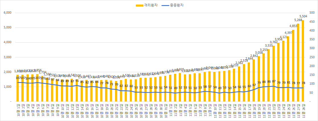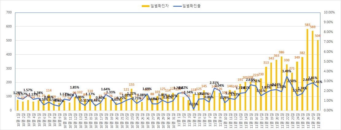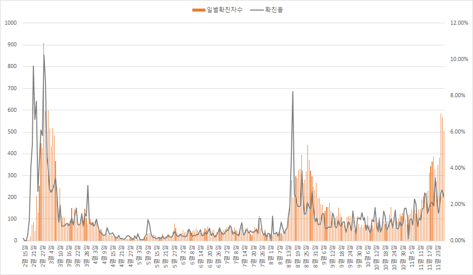 참고로 지난 1,2차 확산 시 주간 평균 최대 확진자수는 각각 567명, 332명이고 확진자수가 연속으로 200명을 넘은 기간은 각각 13일과 15일입니다. 금번 3차 확산은 오늘 기준 주간 평균 지역 감염자 수 400.5명, 12일 연속 200명 이상 발생 중이며 수치가 지속적으로 높아지고 있고 날씨까지 추워지고 있어 가장 주의가 필요한 시기로 보입니다.