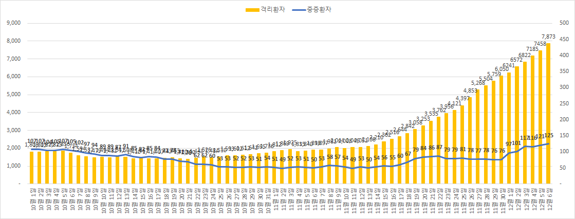 5%에 육박하는 높은 확진율은 현재 추적과 역학조사가 확산세를 따라잡지 못하고 있다는 것을 보여주고 있습니다. 검사대기건수 6.7만 건도 역대 최대치로 다음 주에는 추적검사에 과부하가 예상됩니다. 추적검사가 일시적으로 무력화되면 확산 속도가 더 가파르게 증가할 것으로 예상됩니다.