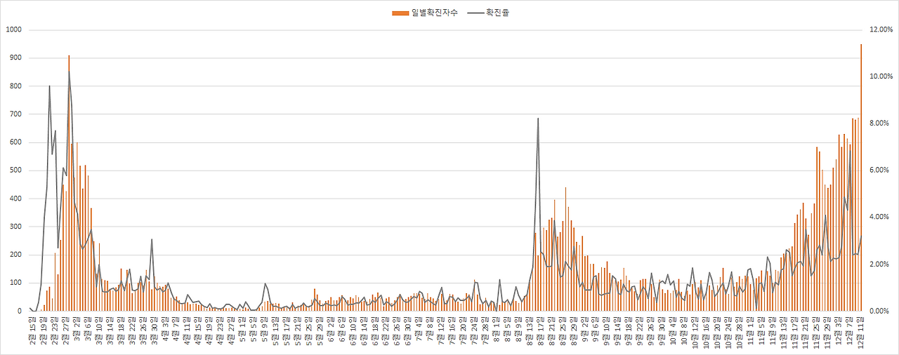 지난 9개월간 코로나 분석을 하면서 국내 방역망이 무너졌다는 생각이 든 적이 없었는데 오늘 안타깝게도 단기적으로 방역망이 무너진 것 같습니다. 진단, 추적, 치료 모든 부분이 감당 가능한 수준을 초과하여 시스템 붕괴가 시작된 것 같습니다.