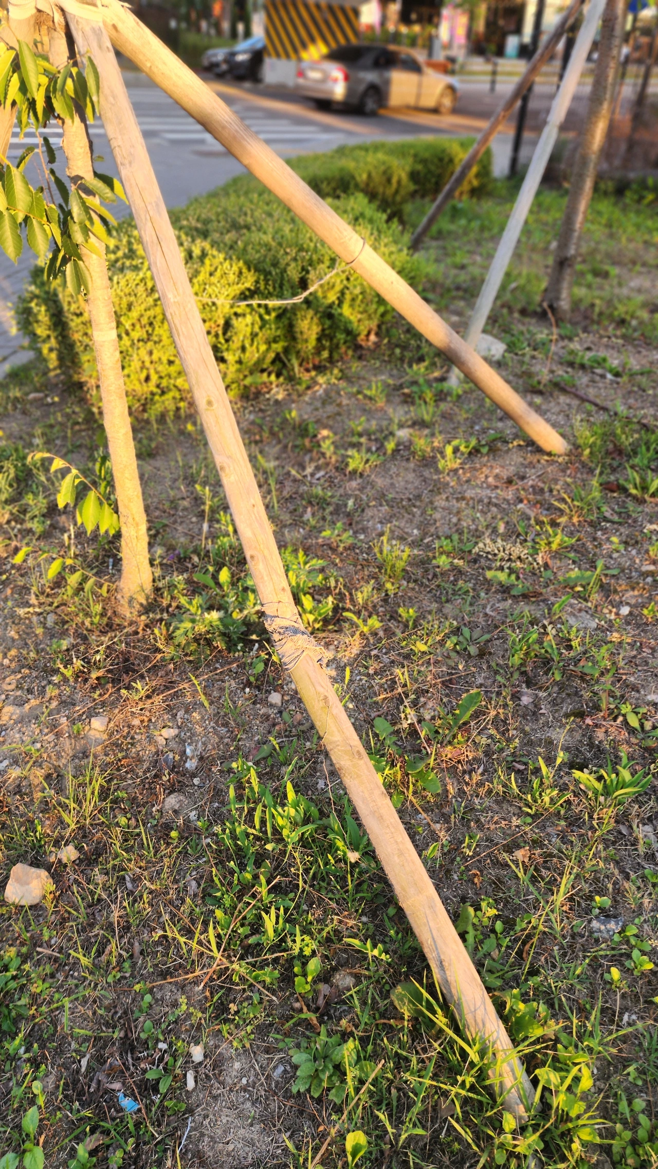 그런데, 이 날은 색다른 버팀목이 보였습니다. 부러진, 아니 부러져서 바닥에 떨어뜨려질 버팀목이었습니다. 그 안타까운 모습에 가던 길을 멈추게 되었습니다.