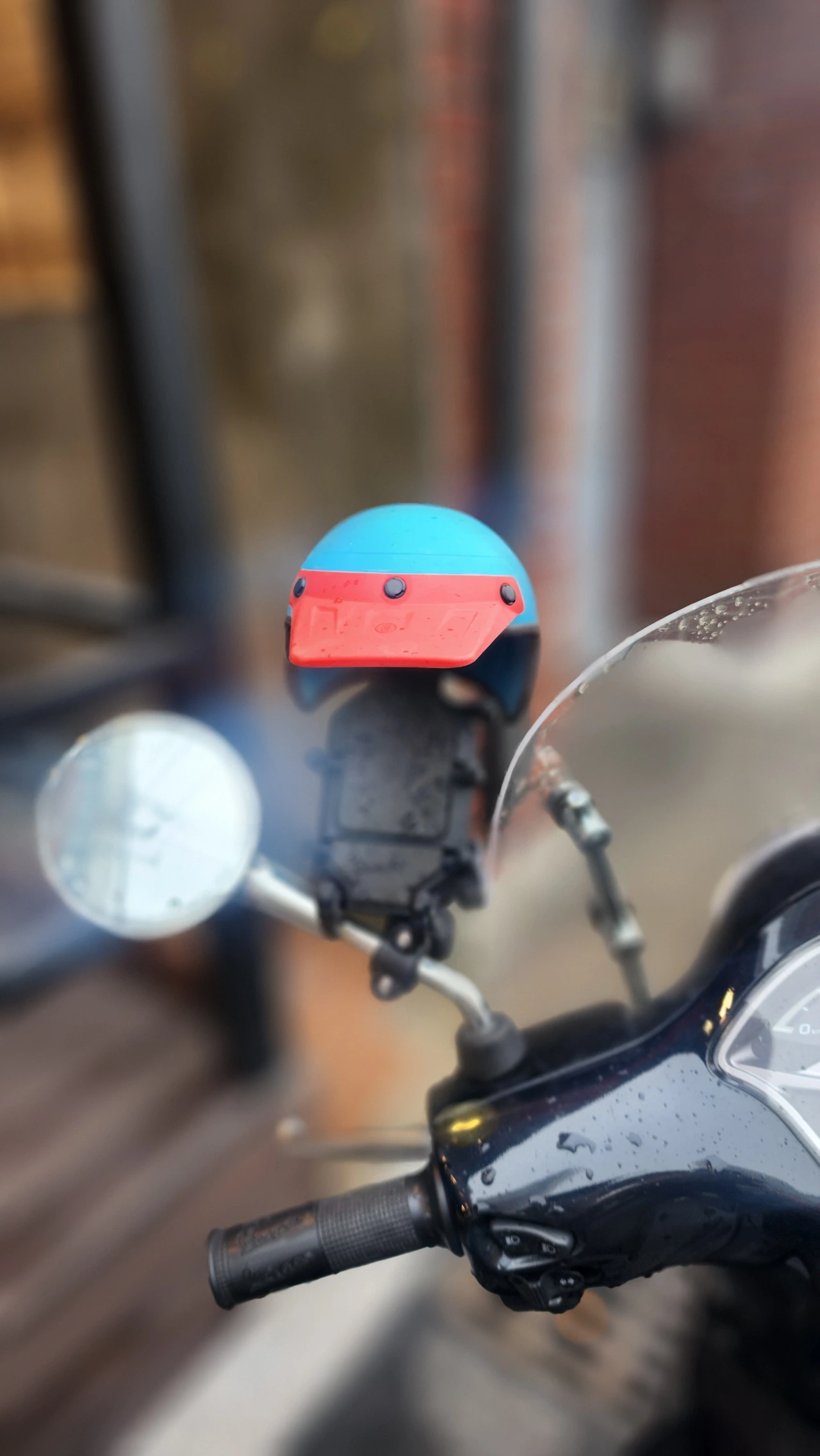기분 좋은 것을 느끼겠다고 방심하다가 오토바이가 빗길에 미끄러져서 큰일 날 뻔한 적이 있었습니다. 그런 과거가 생각나면서 오토바이 손잡이에 붙은 모형 헬멧을 보면서 제 스스로도 '조심'해야겠지만 다른 분들도 '조심'했으면 하는 마음이 간절해지는 시간이었습니다.