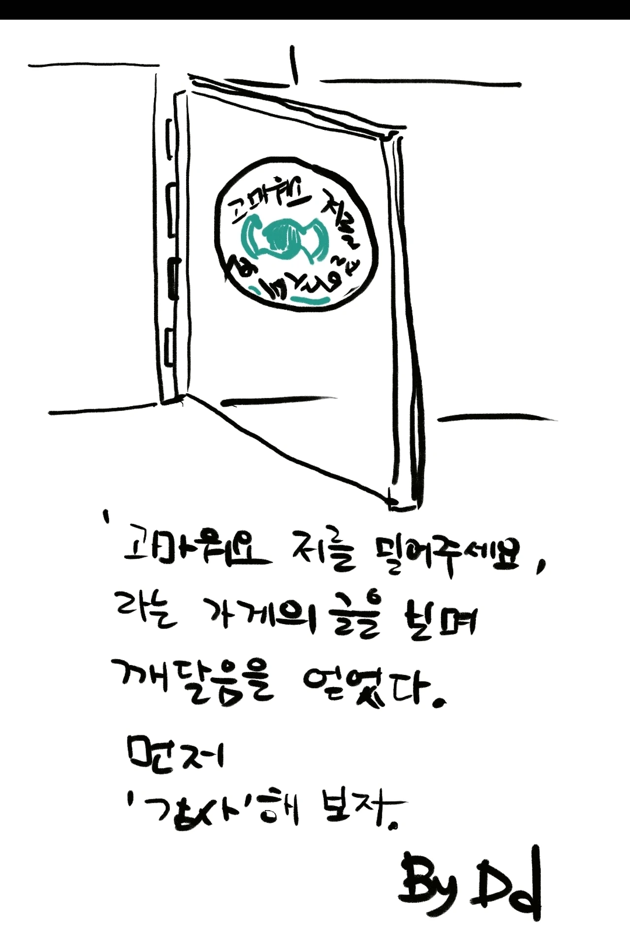 참 좋은 문구라고 생각합니다. 문구를 보는 순간 흐뭇하게 웃으며 메모합니다. 먼저 감사를 표하는 문구에 "싫어. 안 해"할 사람은 없습니다. Push/Pull만 있는 세상에서 우리에게 '먼저' 감사해 보며함께 잘 살아 보자고 하는 것 같습니다. 단순히 길을 걸으며 나의 눈이 이런 좋은 문구도 볼 수 있어서 감사했습니다.