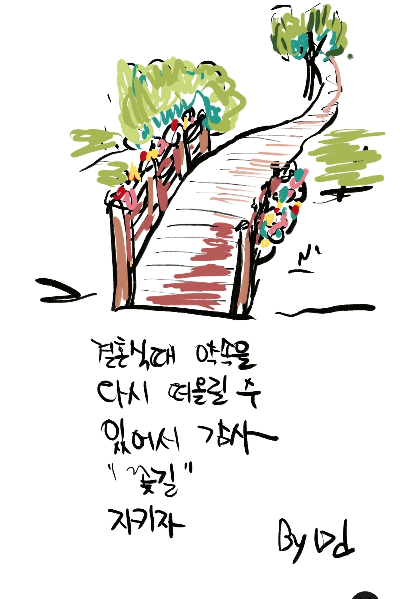 이른 아침 길을 걷다가 꽃들이 장식된 나무다리를 보았습니다. 그 다리너머로 아름다운 광경들이 계속 이어질 거라는 신호인 듯 길 옆에는 다양한 초록 풀들이 이어지고 저 너머 길에는 아름다운 나무도 서 있었습니다. 결혼식 때 마지막 행진이 생각났습니다. 인생의 처음이자 마지막이라고 그렇게 우렁찬 목소리로 대답을 하고 신부가 팔짱을 껴 주면 단 한 번도 멈칫하지 않고 앞만 바라보고 세상 다 가진 표정으로 걸었던 때를 떠올립니다. 걷는 길 양 옆에는 생화들로 꾸며져 있었고요. 앞으로 꽃길만 걷게 해 주겠다는 신랑의 포부를 의기양양하게 약속하는 날이었습니다. 하이힐을 신고 꽃길을 걷던 나의 신부는 지금 맨발로 자갈밭을 걷고 있습니다. 얼른 다시 꽃길로 걷도록 노력하라는 리마인더 같아서 감사했습니다.