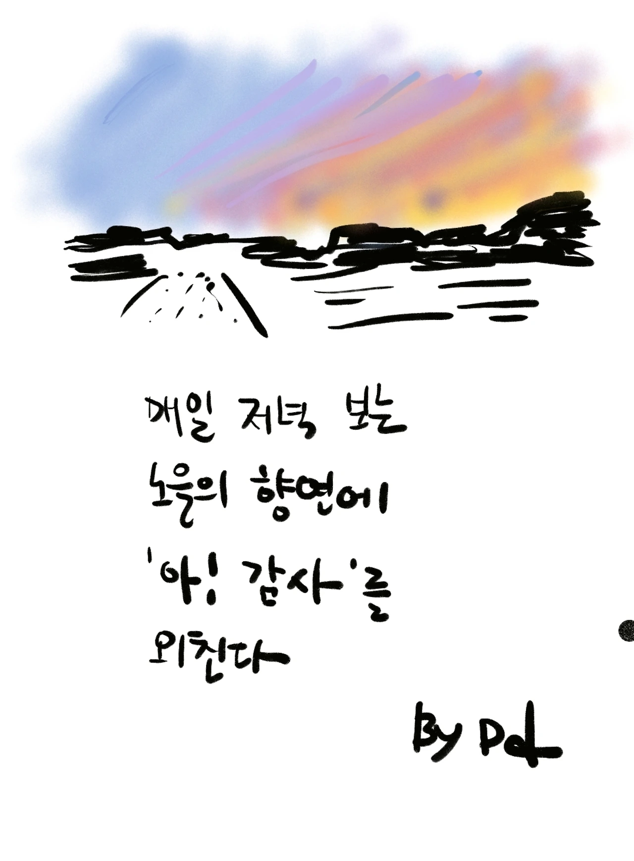 저녁식사 후 아내와 걷기를 합니다. 건강도 챙기고 걸으면서 이런저런 대화도 합니다. 이럴 때 편하게 나누는 대화덕분에 아내의 솔직한 마음들도 많이 듣게 됩니다. 그러면서 경탄할 수 밖에 없는 노을을 종종 봅니다. "노을맛집"을 찾아 다닐 필요도 없습니다. 동네 논두렁 위 하늘이 매일 새로운 노을을 제공해 줍니다. 볼 때마다 "아! 참 감사하다. 이런 걸 매일 보다니요." 감탄을 연발합니다. 다른 사람들도 걷다가 찍느라 멈춰 섭니다. 희뿌연 남색 하늘에 뿌려진 다양한 색깔들의 노을을 맨눈으로 볼 수 있다는 것에 감사합니다.