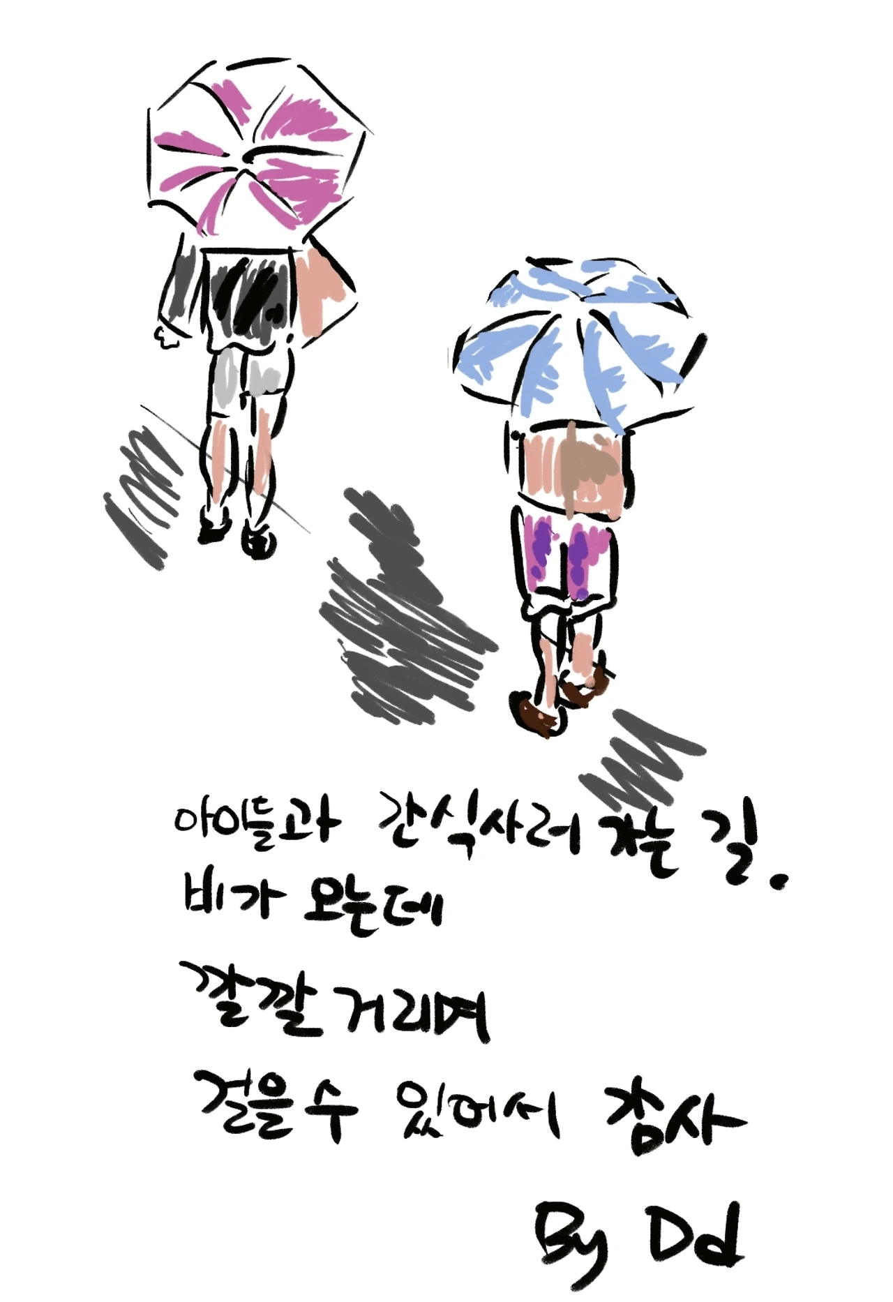 비가 오는 저녁이었습니다. 비가 오지만 간식이 먹고 싶다는 아이들의 의견을 통크게 들어주는 아빠가 되어 봅니다. 슬리퍼를 신고 아이들과 함께 다녀왔습니다. 물웅덩이를 밟아서 슬리퍼가 벗겨졌는데도 껄껄껄 하며 아이들과 마트를 다녀왔습니다. 간식을 계산하고 나니까 큰 아이는 자기가 가방을 들겠다고 하고요.