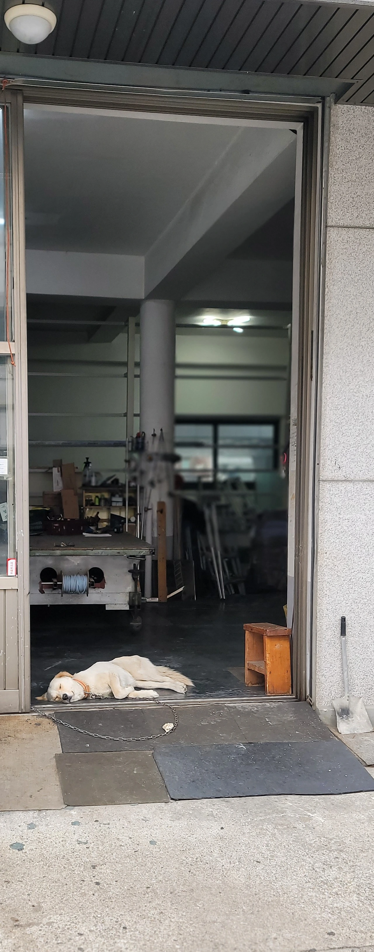 오랜만에 낮잠 자고 있는 개를 만났습니다. 가게 문 앞에 바람 솔솔 드나드는 자리에 누웠고요. 시원한 바닥을 벗 삼아 늘어지게 자는 중이었습니다. 사람 인기척에도 꿈쩍하지 않습니다. 오랜만에 본 '개낮잠'이 반가워서 상상해 봤습니다.