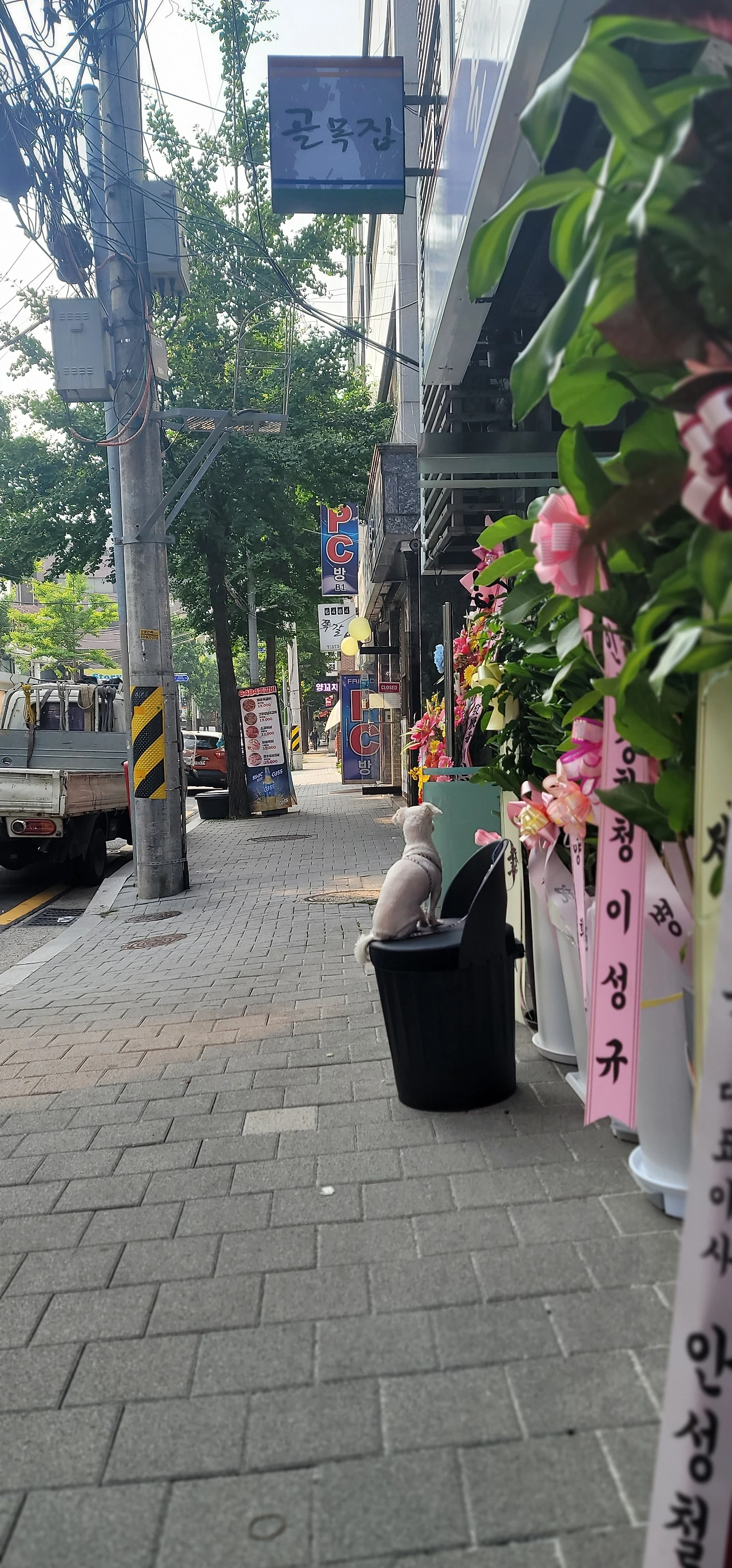 길을 가다 봤습니다. 작은 개업식당에 강아지가 의자에 앉아 있었고요. 밖에 나가 있어야 하는 건지 누굴 기다리는 중인지는 모릅니다. 의자에 앉아서 하염없이 어딘가를 보고 있는 게 웃겨서 찍었고 상상을 펼쳐 봅니다.