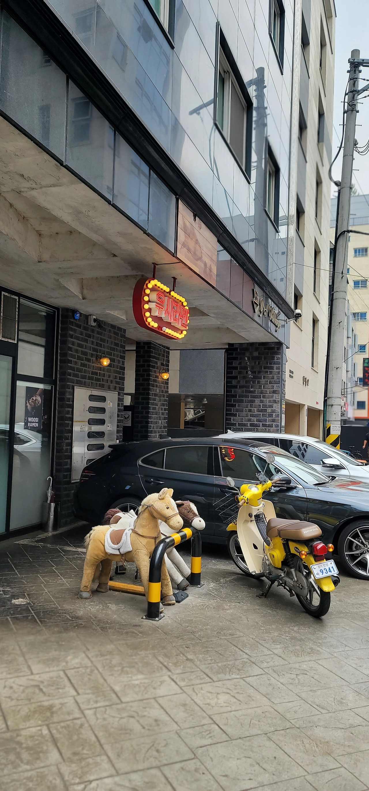 점심때 길을 걷다가 그 자리에 그냥 딱 서버렸습니다. 너무 재밌는 연출이 저를 멈추게 한 것입니다. 저 녀석들이 먹고 나서 쉬는 시간일까? 주인이 먹으러 가느라 메어 둔 것일까? 오토바이는 뭘까? 저들의 조합을 만든 사장님의 센스에 '빵'터져 버렸습니다. 아닌가? 진짜로 손님 것인가?