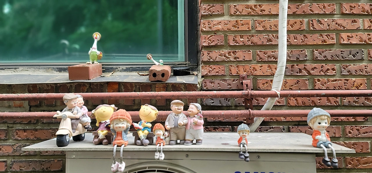 뜨거운 여름 점심시간에 동네를 걷다가 만난 인형 대가족입니다. 에어컨 실외기에 가족 모두를 모아서 배치한 주인집 센스에 웃음 짓다 보니 땀이 줄줄 흐르는 것도 잊고 잠시 서 있었습니다. 저의 바람은 저 인형들이 비바람에 날아가지 않았으면 좋겠고, 골목을 지나다니는 사람들이 "ㅋㅋ" 웃는 날이 이어지면 좋겠습니다. 그런 느낌으로 제 상상을 더해 보았습니다.