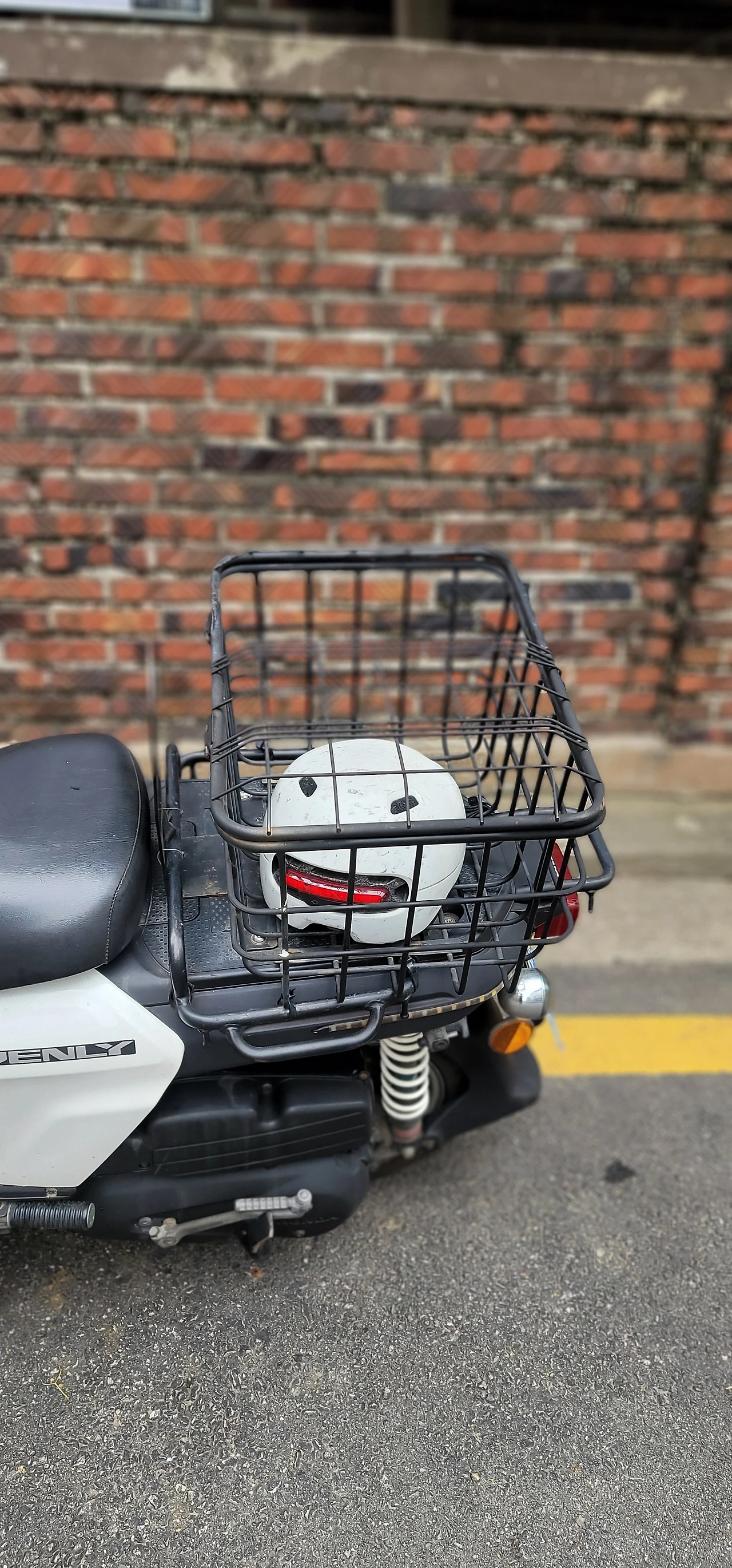 골목을 돌면서 만난 오토바이 바스켓 속 헬멧입니다. 그 모습이 꼭 닭장 안의 하얀 닭 같았습니다. 얼굴은 심히 짜증을 내는 것 같았고요. 갇혀서 나오지는 못하고, '나 여기 있다.'라고 어필하는 것 같습니다. 그것을 보면서 잠시 상상해 봤습니다.