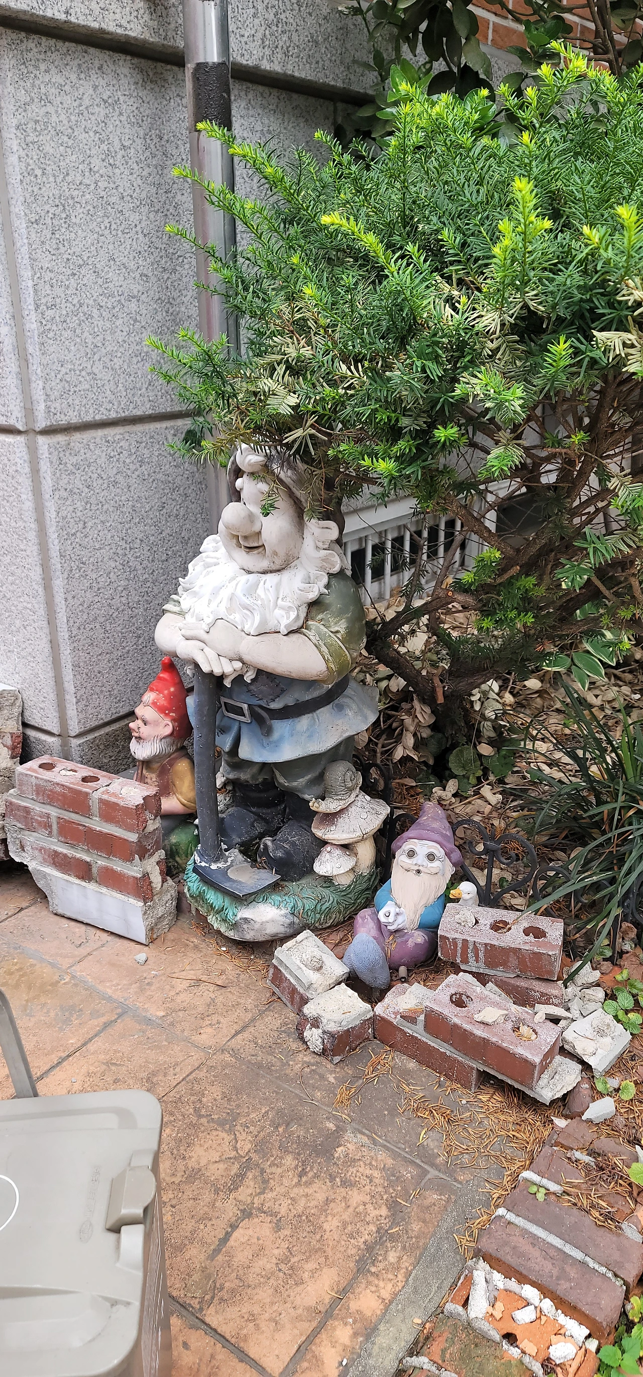 골목을 걷다가 빌라 입구에 세워놓은 변색된 난쟁이 인형 셋을 보았습니다. 무릎 아래까지 크기이고 나무들 아래에 있어서 보기는 쉽지 않습니다. 저도 어쩌다 보게 되었고요. 난쟁이 인형의 빛바랜 색깔, 눈빛, 모습들이 재밌어서 상상해 봤습니다.