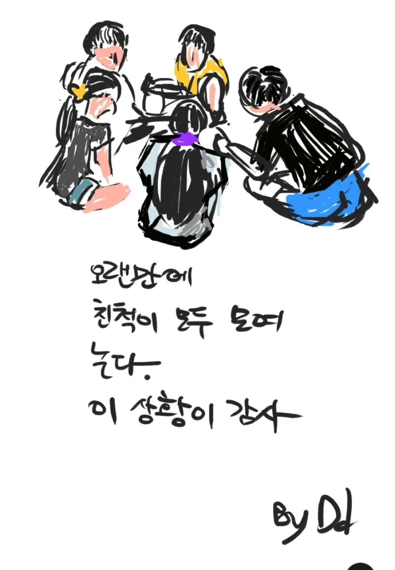 오랜만에 해외에서 가족이 방문했습니다. 엄마아빠들은 노부모를 또 만났다는 기쁨에 행복해했고요. 아이들은 아이들끼리 오랜만에 또 놀 수 있다고 즐거워했습니다. 가족은 이런 것인가 봅니다 피가 섞여 있고, 서로가 서로를 진심으로 좋아하고 뭐든지 주고 싶고 함께 하고 싶어합니다. 경계와 계산은 없습니다. 그런 분위기속에서 아이들은 마음껏 소리지르고 함께 놀이하고 뭐든지 신나게 먹어댑니다. 오랜만에 봐도 어제 밥 먹고 놀다가 헤어진 느낌으로 노는 것. 그것이 가족이겠지요. 흐뭇한 마음에 기분좋아하며 그 모습을 메모해봤습니다.