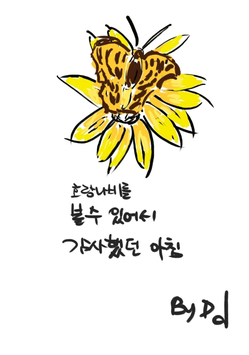 일찍 눈이 떠진김에 산책삼아 시골길을 걷고 있었습니다. 비온 다음날이라 아침해가 이미 뜨겁게 내리쬐고 있고요. 초록초록한 잎들 사이로 노란 꽃이 보였습니다. 그 꽃위로 위풍당당한 호랑나비가 알록달록한 무늬를 자랑하며 나름대로 일하고 있었습니다. 초록초록 사이에 노랑노랑 꽃과 호랑나비는 무시하고 지나갈 수 없을만큼 아름다웠습니다. 그 모습을 숨죽이고 지켜보면서 자연 속에서 보석을 찾은 듯한 느낌이었습니다. 자연의 신비에 감사하면서 볼일을 끝낸 호랑나비가 별일없이 팔랑팔랑 날아서 자기 길을 잘 갔으면 좋겠습니다.