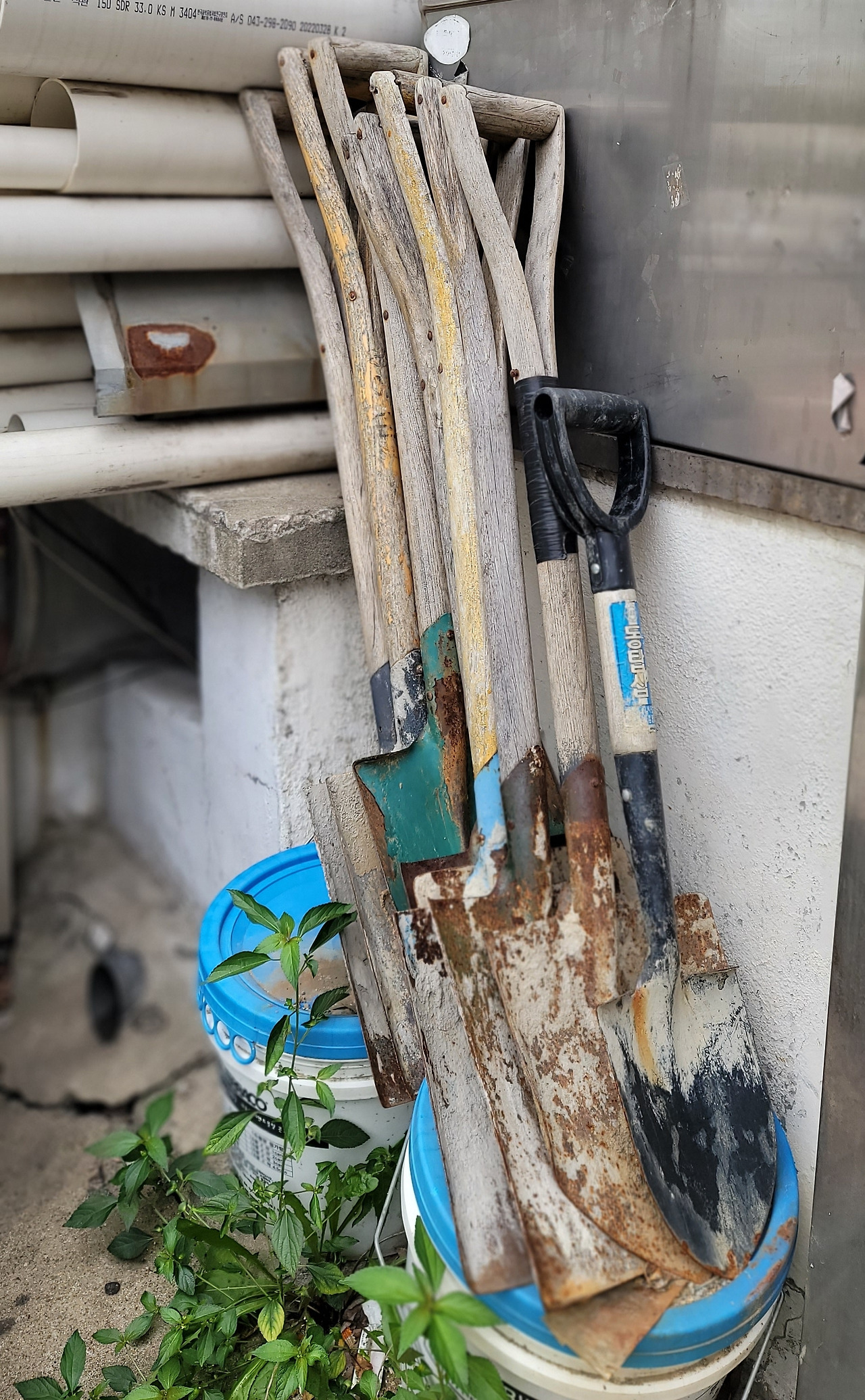 샾 앞에 삽들이 차곡차곡 놓여 있었다. 다음작업을 위해 잘 정리해 놓으신 사장님의 마인드를 본받을만했습니다. 사용한 지 오래 하신 듯 빛바랜 삽자루와 수많은 삽질을 통해 작업의 흔적이 고스란히 남아있는 삽을 보면서 숨길 수 없는 "은근한 노련미"도 느낄 수 있었습니다. 모아 둔 삽만 봐도 “일 좀 오래 해본 사람이 주인임” 이 느껴졌습니다. 그래서, 일보다 엉뚱한 상상을 해봤습니다.