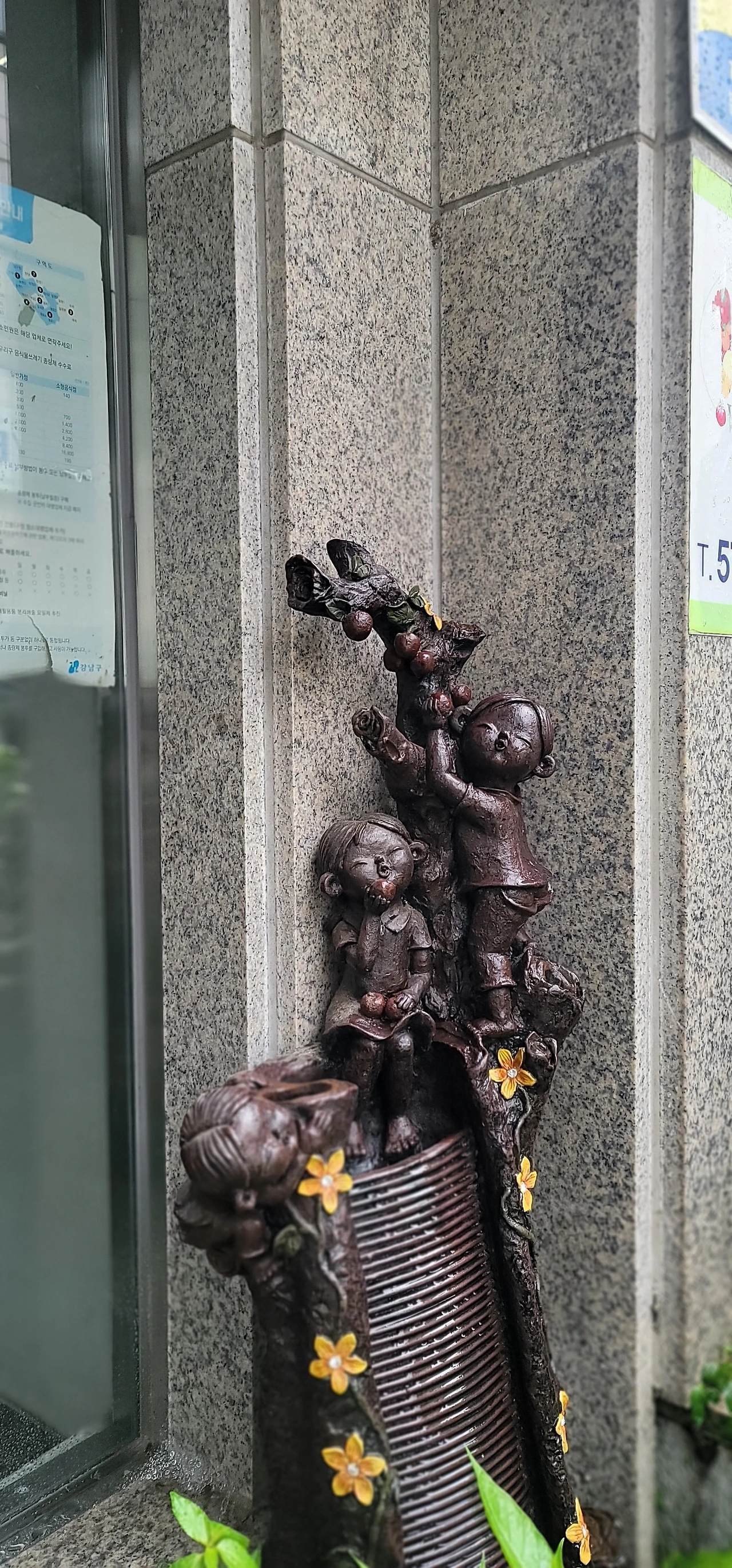 건물입구에 놓여 있는 물건입니다. 거기에 다양한 표정으로 감 따는 모습이 저희 가정 삼남매 같아서 잠시 시선이 머물렀습니다. "하하"웃고는 잠시 서서 노는 모습을 지켜보고 있었습니다. 작은 것들은 다 귀엽고 재밌고 아름답습니다. 그것을 만든 작가의 의도도, 거기에 놔둔 주인의 의도도 생각해봤고요.