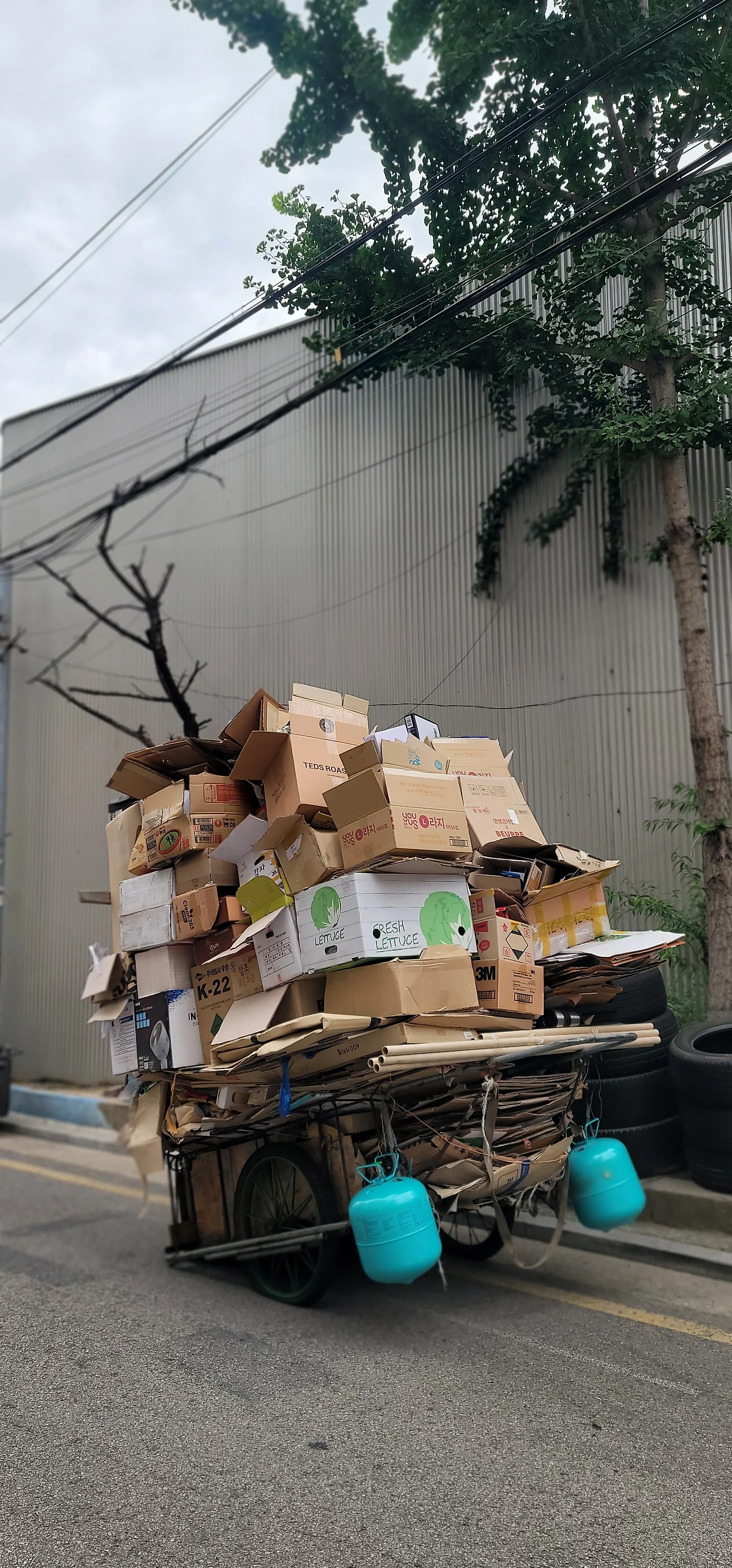 아무 생각없이 길을 걸을 때도 있습니다. 그런데, 신기하게도 시선을 끄는 광경이 눈에 들어 옵니다. 찾으려고 한 것도 아니고 너무도 눈에 "콕"들어오는 것들도 있어서 놓칠 수도 없고요. 안 찍을 수도 없고요. 상상안할 수도 없습니다. 그렇지만 "무상지급"받는 느낌이라서 재밌기도 합니다. 손수레 높이 쌓아올린 박스덕분에 흥겨울 주인도 생각나고 나름대로의 센스로 양쪽에 매달아 놓은 가스통도 재밌었습니다.