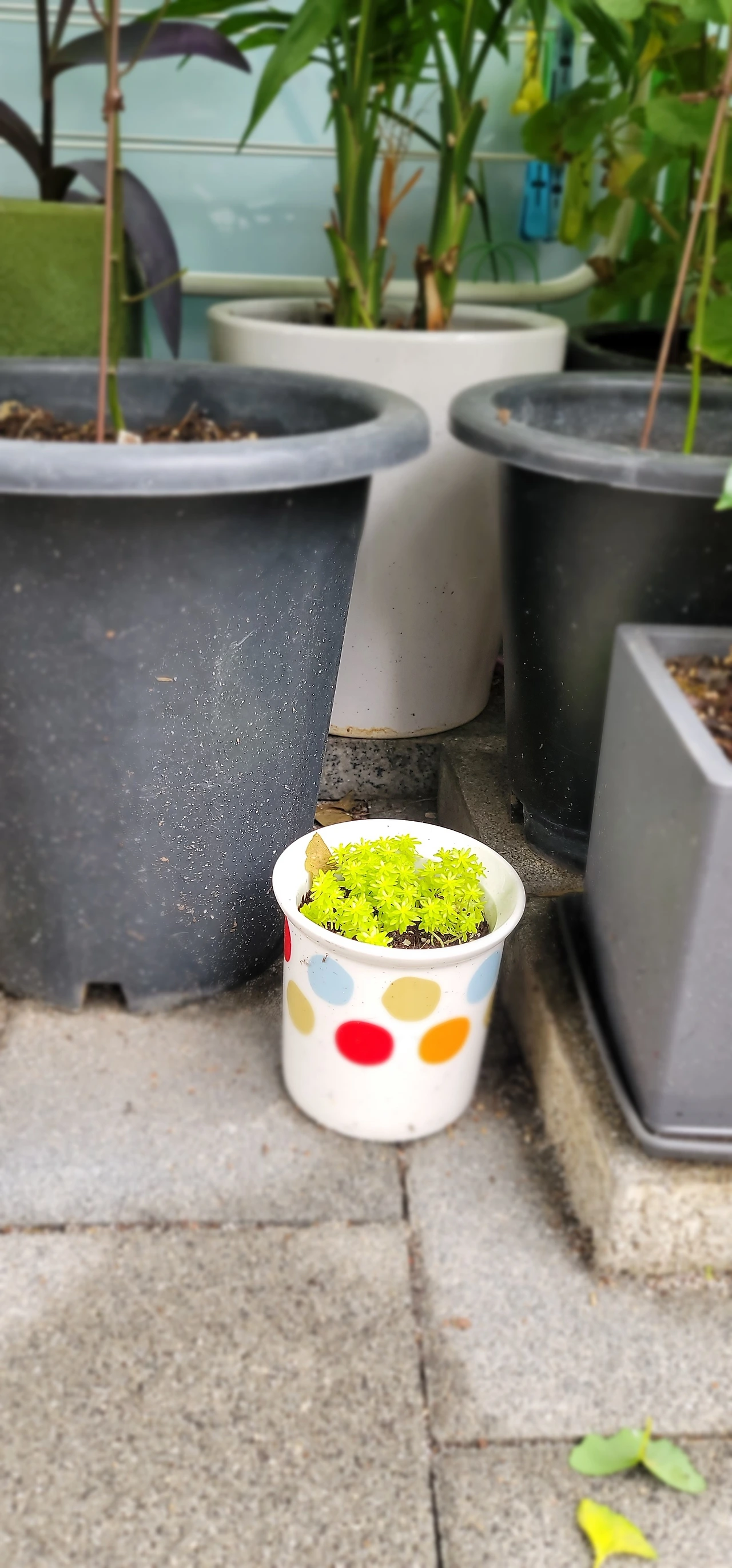 점심 식사후 다시 살이 차오르는 느낌에 발걸음을 재촉하며 걷고 있는 중이었습니다. 크고 어두운 화분들 밑에 작은 화분이 눈에 들어왔습니다. 회색빛 화분을 배경으로 알록달록한 작은 화분이 더 도드라져 보였습니다. 색깔도 예쁘고 모양도 무늬도 아기자기했습니다. 마치 어른들 앞에 서 있는 아이같은 느낌이었습니다. 요즘에는 어른들앞에 아이, 큰 물건앞에 작은 물건들, 큰 차앞에 소형차들을 봐도 아이들이 생각나기도 합니다. 작은 것들은 모조리 예쁘게 보입니다. 우리 아이들의 옛날 모습도 생각나게 하는 화분이었습니다.