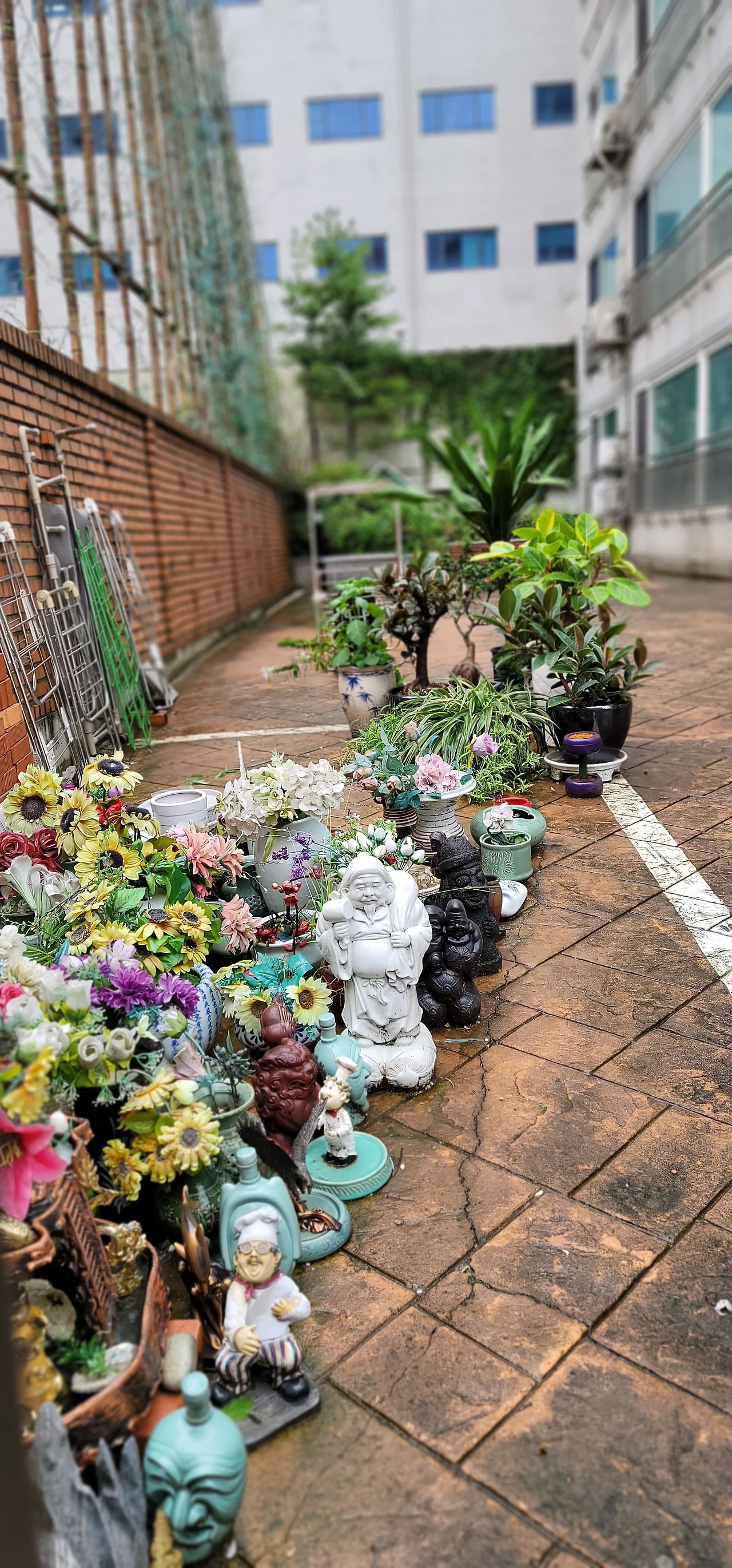 길을 걸어다가 어떤 철문사이로 봤습니다. 바닥에 한가득 내려놓은 다양한 꽃들과 각종 사기받침대, 인형들이 시선을 끌었습니다. 처음에는 알록달록한 게 뭔가 싶었습니다.