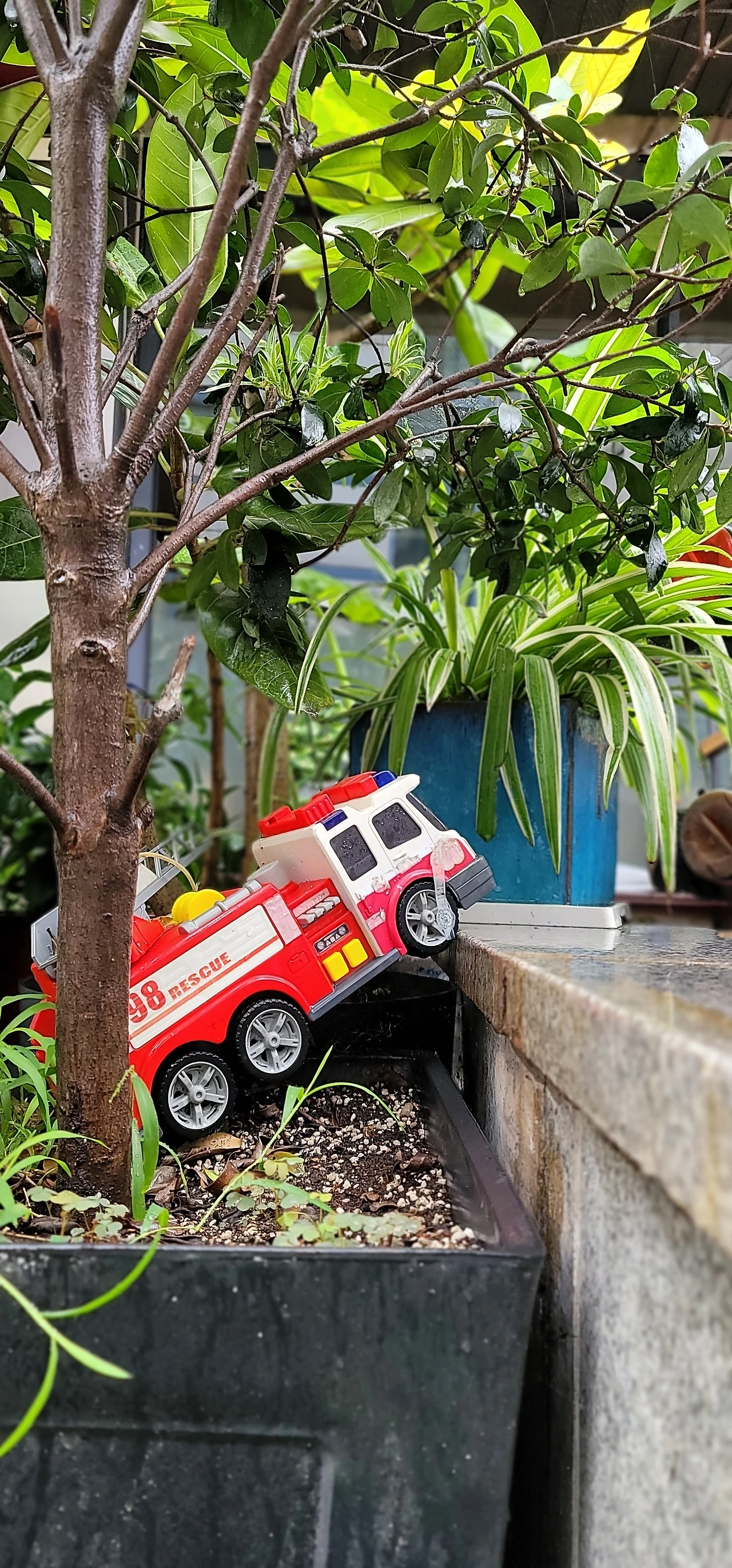 바로 '소방차 장난감'이었습니다. 주인의 위트로 화분 테두리에 걸쳐놨구나 싶었습니다. 그냥 지나치는 건 예의가 아니다는 생각으로 잠시 음미했습니다. 혼자 중얼거렸습니다. '구출을 위해 출동하는 건가? 아니면 널 구해줘야 하는 건가?'라면서 사진을 찍고 잠시 아이들 애니메이션도 떠올려봤습니다. 한편으로는 이런 생각도 했습니다. 우리도 살아가면서 저렇게 힘겹게 '아등바등'하고 있지는 않을까? 그러면서 남들을 밟고 앞서려고 힘들게 사는 건 아닐까?