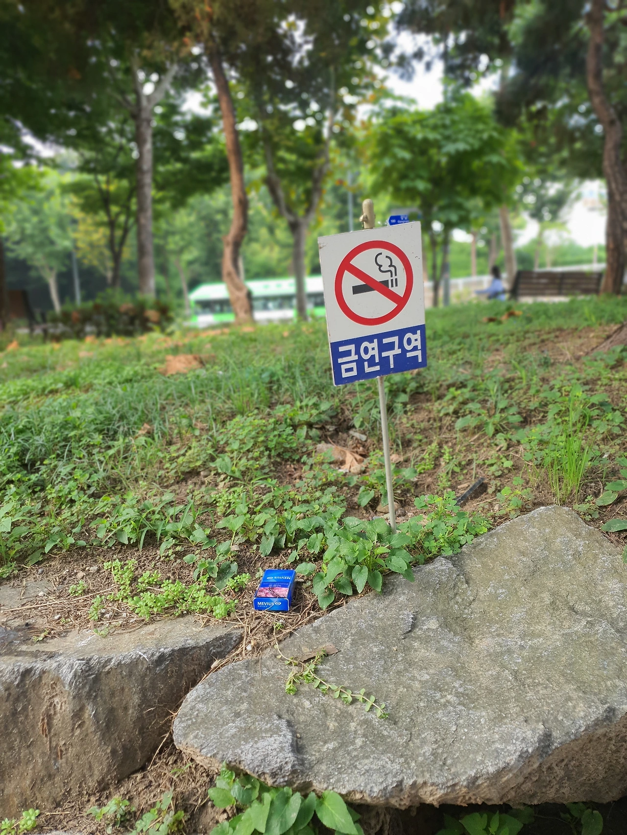 금연구역 안내문은 가로수밑 잔디밭을 보호하고 주차구역도 깨끗하게 사용하자는 취지로 설치했을 것입니다. 그런데, 그 안내문 옆에 버젓이 담뱃갑을 던져 놓은 것은 재미가 없었습니다. 혹여 그 앞에서 흡연을 했더라도 그렇게까지 담뱃갑을 던져놓을 필요가 있었을까 싶었습니다. 다른 사람들과 살아가는 도시 공간 속에서 지킬 것은 지키는 문화가 정착되었으면 하는 바람을 가져봅니다.