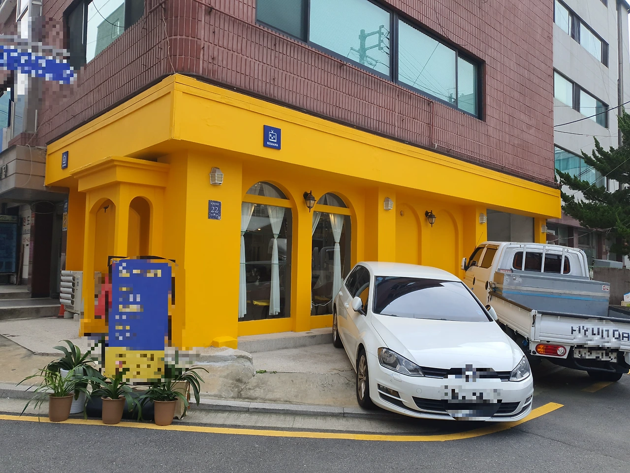 가까이 다가갔더니 심장이 더 쿵쾅거렸습니다. 제 표현에 의하면 "쌧노랑색'으로 전체 페이팅 되어 있었습니다. 이 정도로 튀게 페인팅했다는 것은 기술력으로는 자부심이 있다는 것으로 느껴집니다. 또, 무채색 건물들 사이에서 골목모퉁이에 "노랑노랑"한 가게는 깜깜한 밤 가로등 불같았습니다. 이 가게 앞에서는 아무 일도 안 일어날 것 같고, 가냘픈 여학생도 무서워하지 않고 지나갈 것 같았습니다.