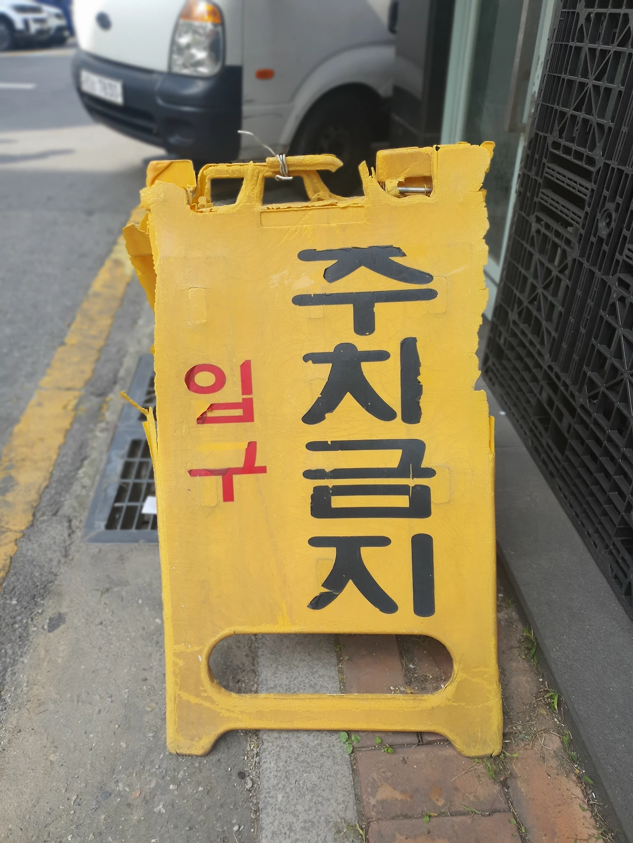 사장님께서 돈을 아끼면서 사용하고 있으신 것 같고요. 그런 것을 보면서 "짠돌이 사장님"이라고 속으로 생각했습니다. 한편으로는 오랜 시간 한결같은 "주차금지 알림"을 하면서 변함없이 사용되고 있는 표지판의 우직함을 느낄 수 있었습니다.