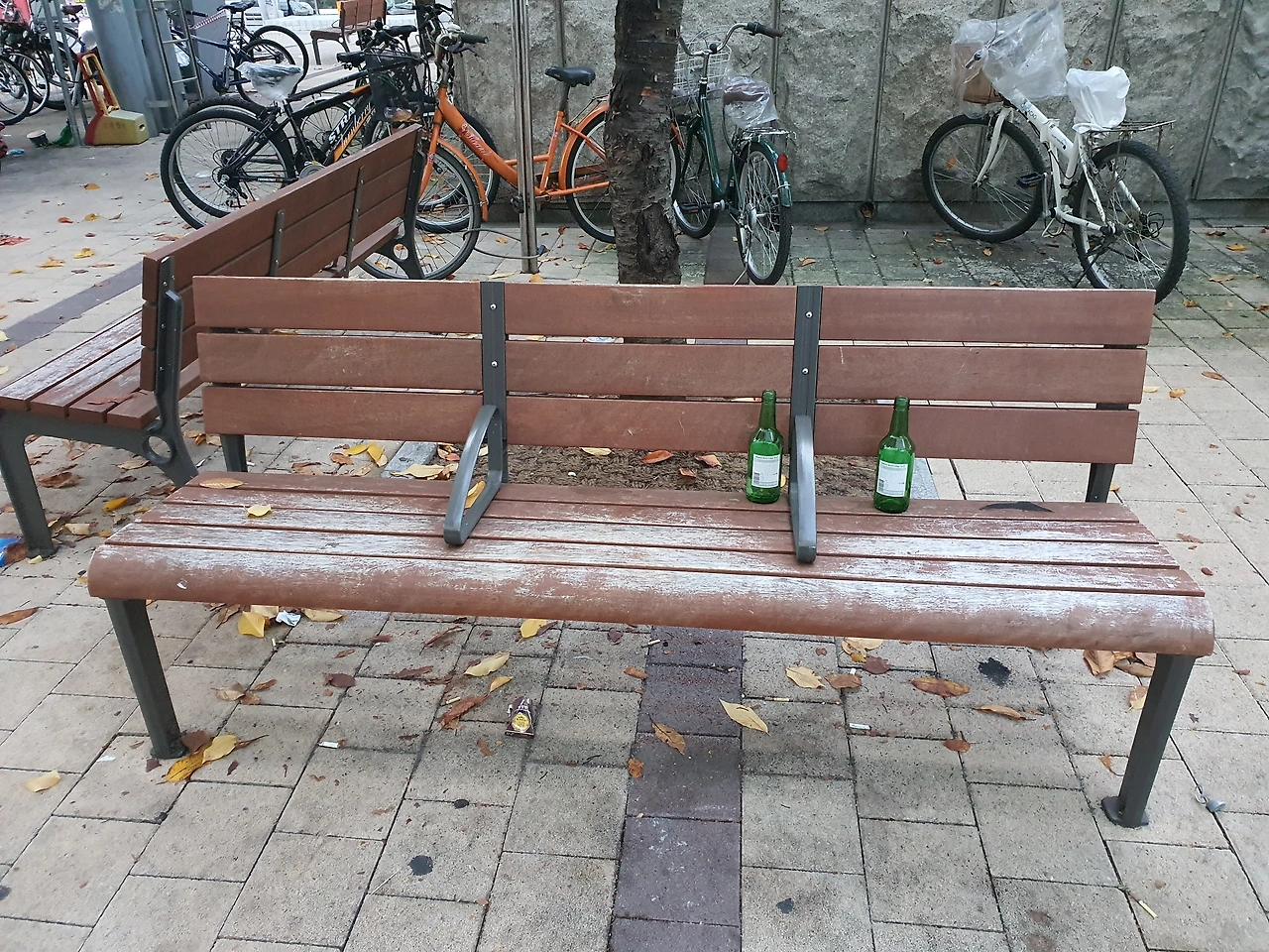 어젯밤 즐겁게 한 잔 하시고 헤어지기가 아쉬우셔서 대중교통 옆 벤치에 앉아서 각 1병씩 더 하시다가 귀가하셨나 봅니다. 그렇게 상상해 봤습니다.